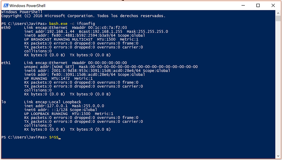 - Bash en Windows con Ubuntu 16.04: y con un montón de cosas más que refuerzan ese Windows Linux Subsystem (¡ifconfig pirula!). No lo uso casi nunca, pero me gusta que Microsoft siga avanzando aquí, y de hecho han explicado todas las novedades, que son muchas, aquí. Puedes ejecutar binarios Windows desde la consola bash, y binarios Linux desde Windows (CMD o Powershell) con un "bash.exe -c <comando>". Funciona (por ejemplo con ifconfig), os lo aseguro. Mooola.