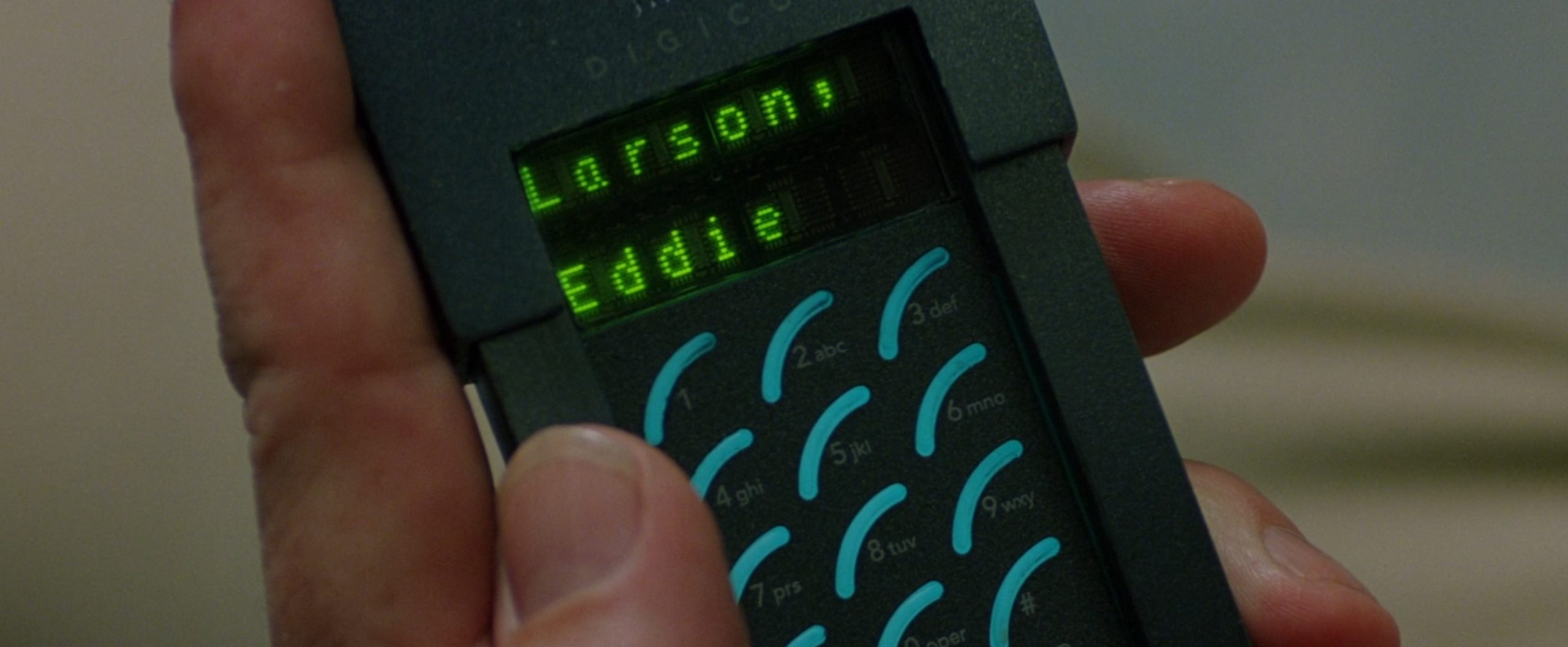 O incluso, ya puestos, la movilidad. Michael Douglas ya es famoso por usar el primer teléfono móvil de la historia, el Motorola DynaTAC 8000X, en 'Wall Street' (1987), pero aquí fue un poco más allá y usó uno que ni siquiera existía, un simulacro de producto real que daba un poco el pego y que era de una empresa ficticia llamada Digicom. Lo que molaba era que empeza a teclear el apellido de un contacto y al poco aparecía el nombre completo.