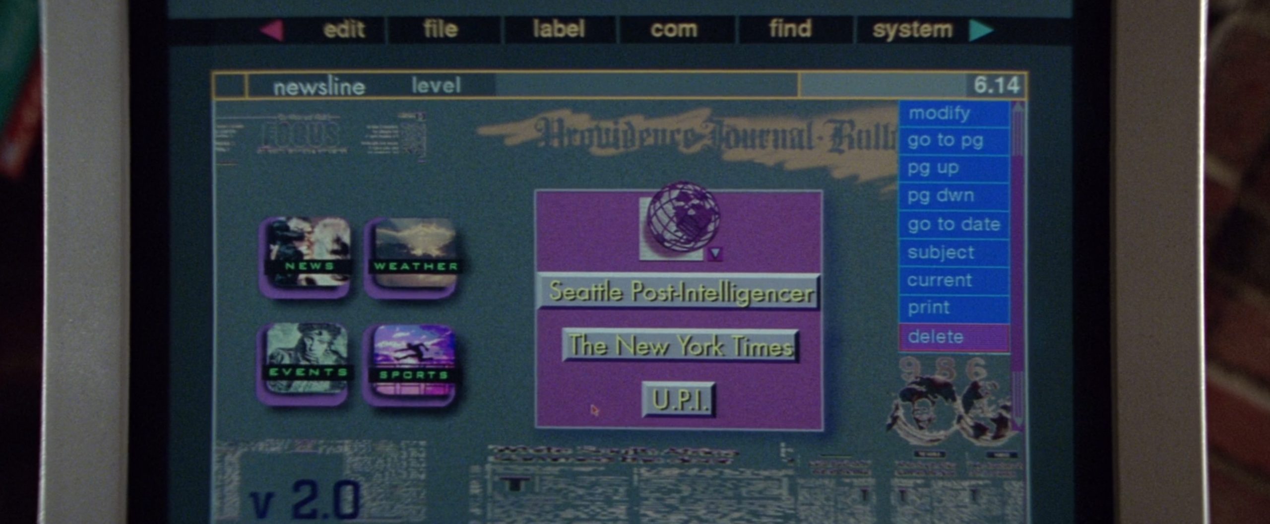 Hay también un momento en el que Michael Douglas tiene que buscar información en internet y acceder a un periódico. En la interfaz aparecen tres (Seattle Post-Intelligencer, The New York Times y U.P.I. —a saber—) además de iconos de acceso a esa sección de noticias, el tiempo, eventos y deportes. Como diseño de portal de internet en 1994, uf.