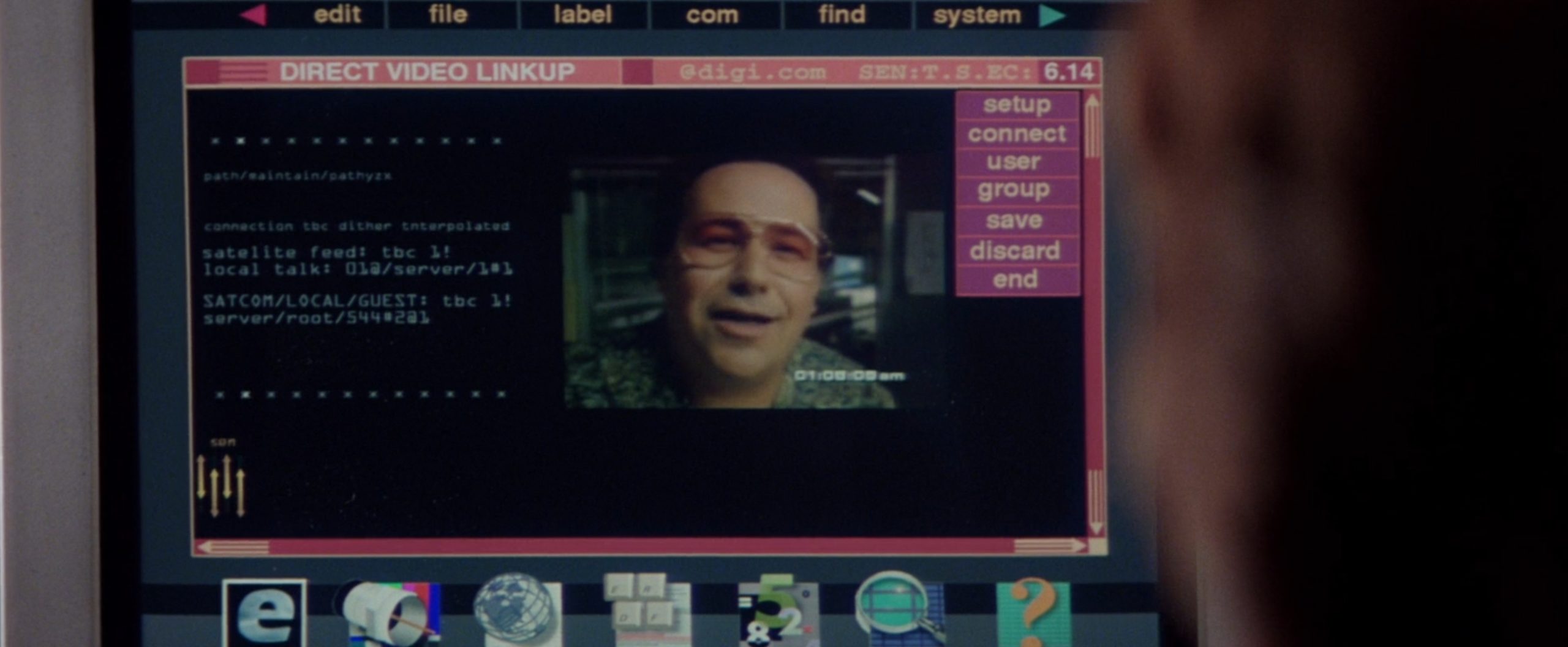 El caso es que durante varios momentos de la película se ven algunas ideas curiosas y terribles de aquella interfaz, que no tenía una consola al uso pero que permitía videollamadas bastante majas (de nuevo, con una interfaz horrorosa) y ejecutar comandos "parecidos" a los reales como quién era (whois) un usuario con cierta dirección de correo.