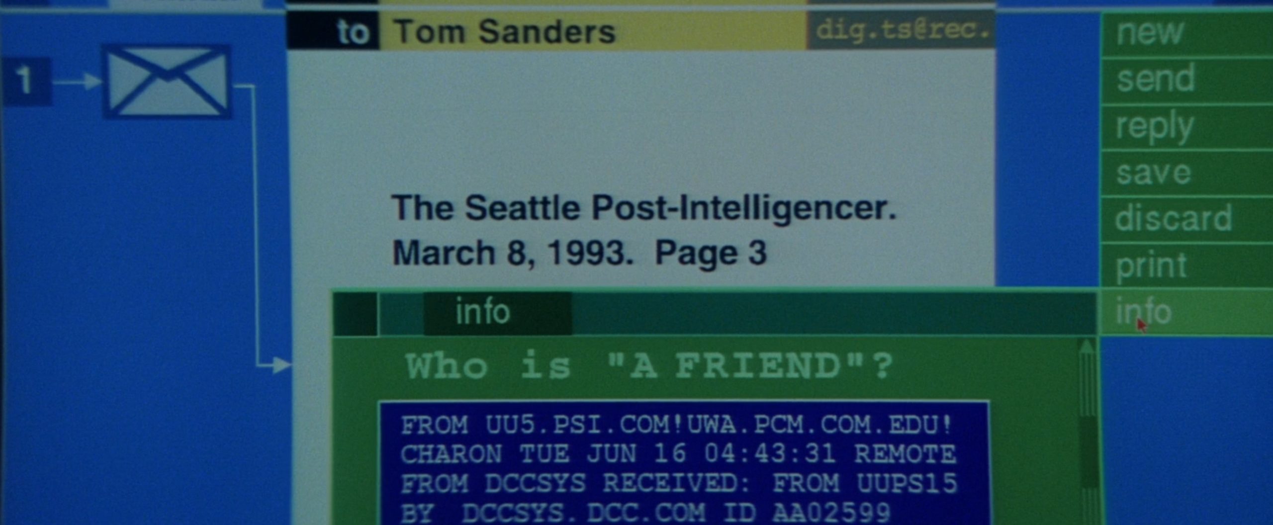 Y a pesar de ello, en la peli no muestran esa interfaz, y en lugar de eso diseñaron una especie de escritorio en el que lo esencial era el correo electrónico, con una interfaz terrible (sobres en blanco sin mostrar nombres o asunto del mensaje) que era muy de 'Jurassic Park', donde se usaron y donde la niña pronuncia aquellas famosas palabras de "¡Es un sistema Unix, lo conozco!". Aquí, como digo la interfaz es un frankenstein que supongo que usaron por temas de licencias. No entiendo qué problema había, porque desde luego se ve claramente que las máquinas son de Silicon Graphics.
