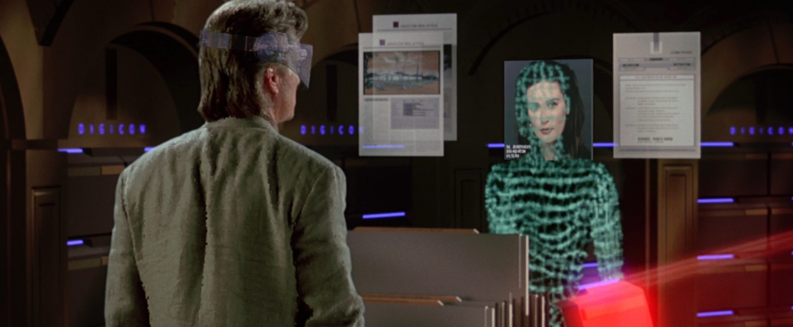 También me resultó gracioso —y horroroso— cómo aparece el "avatar" de Demi Moore cuando ella se conecta para borrar ficheros y Michael Douglas lo está viendo en ese entorno virtual. Aunque terrible como implementación, la idea no se aleja tanto de lo que Mark Zuckerberg nos propuso con su metaverso hace poco.