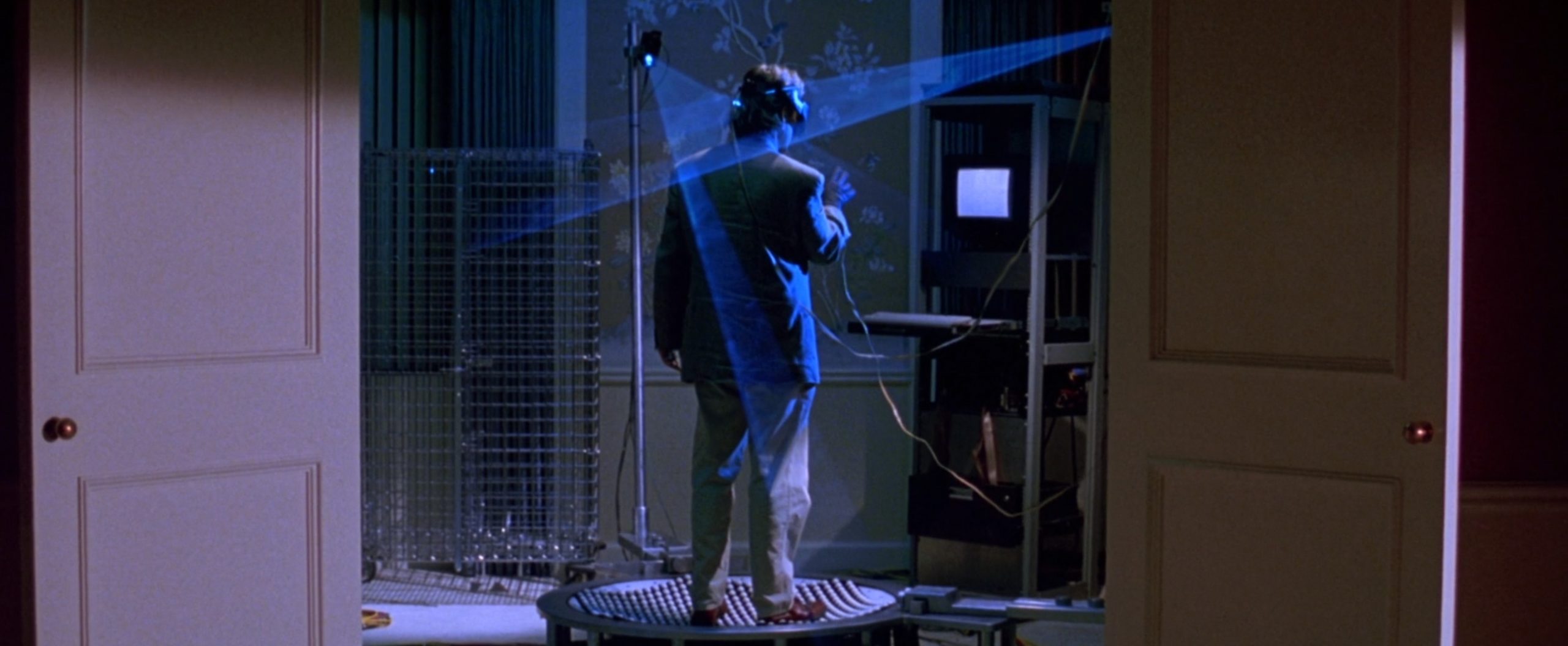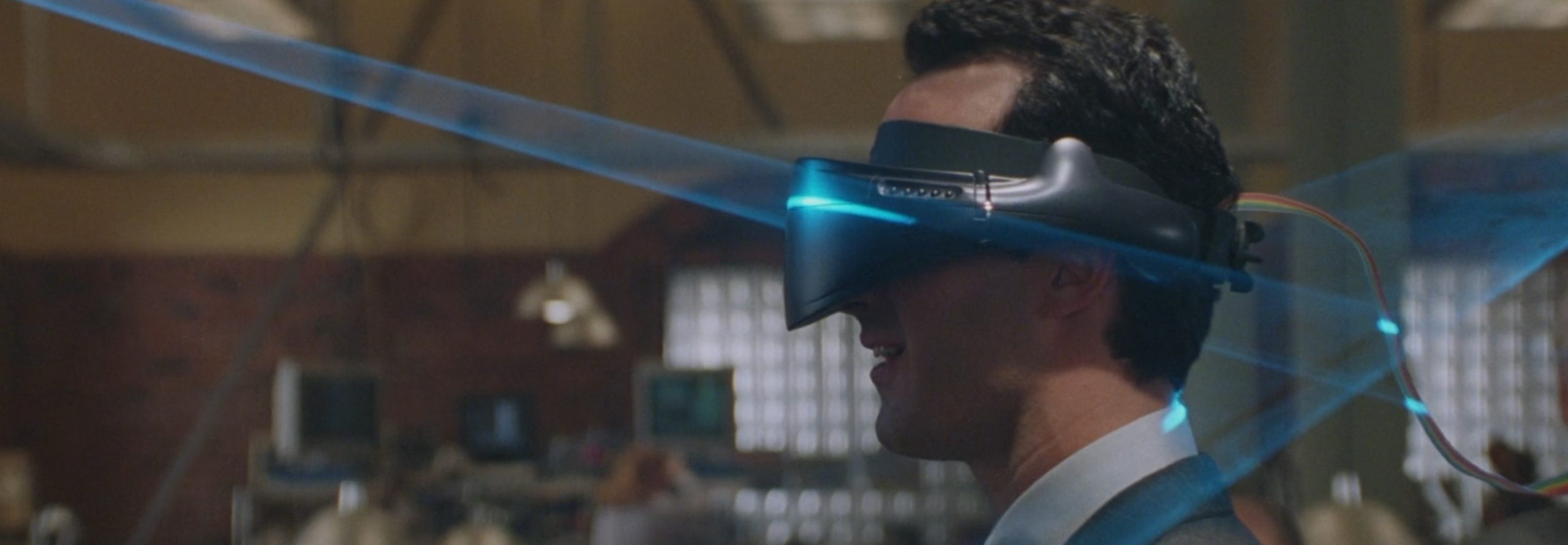 Pero claro, luego llegamos al momento álgido de la peli, y ahí es donde Michael Douglas tiene que averiguar algo y la única forma de hacerlo es usar el prototipo de sistema de realidad virtual de la empresa. Antes, por cierto, lo muestran con más detalle cuando lo usa uno de los directivos implicados en la trama. Fijaos: el diseño no dista mucho de las Vision Pro. Qué curioso cómo al final todos se copian de todos y de todo.