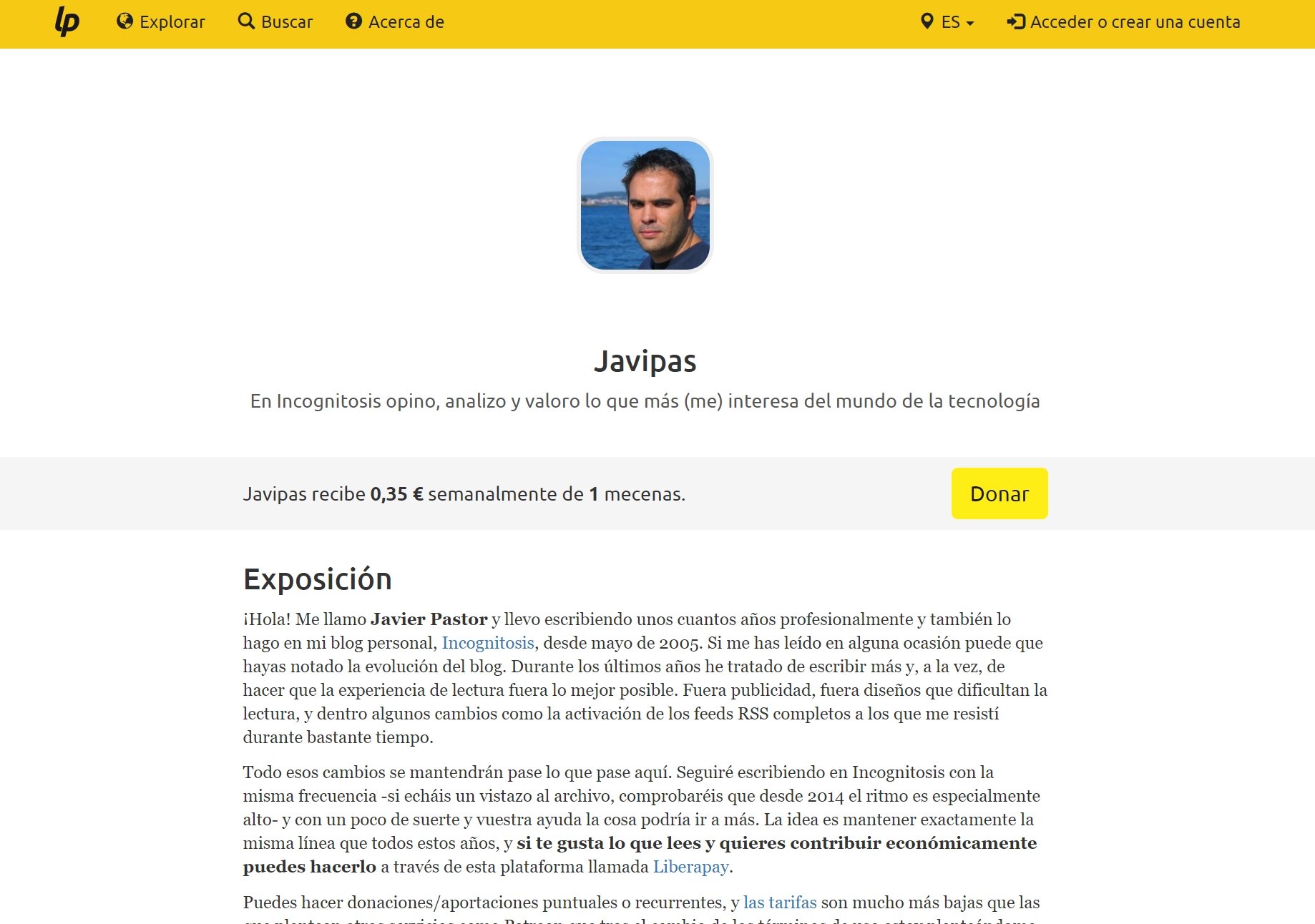 - Privacidad: no sé exactamente quién aporta dinero (a no ser que tú quieras que lo sepa), y yo puedo decidir o no si compartir cuánto me estáis aportando. Es un dato que compartiré públicamente en mi perfil en Liberapay.