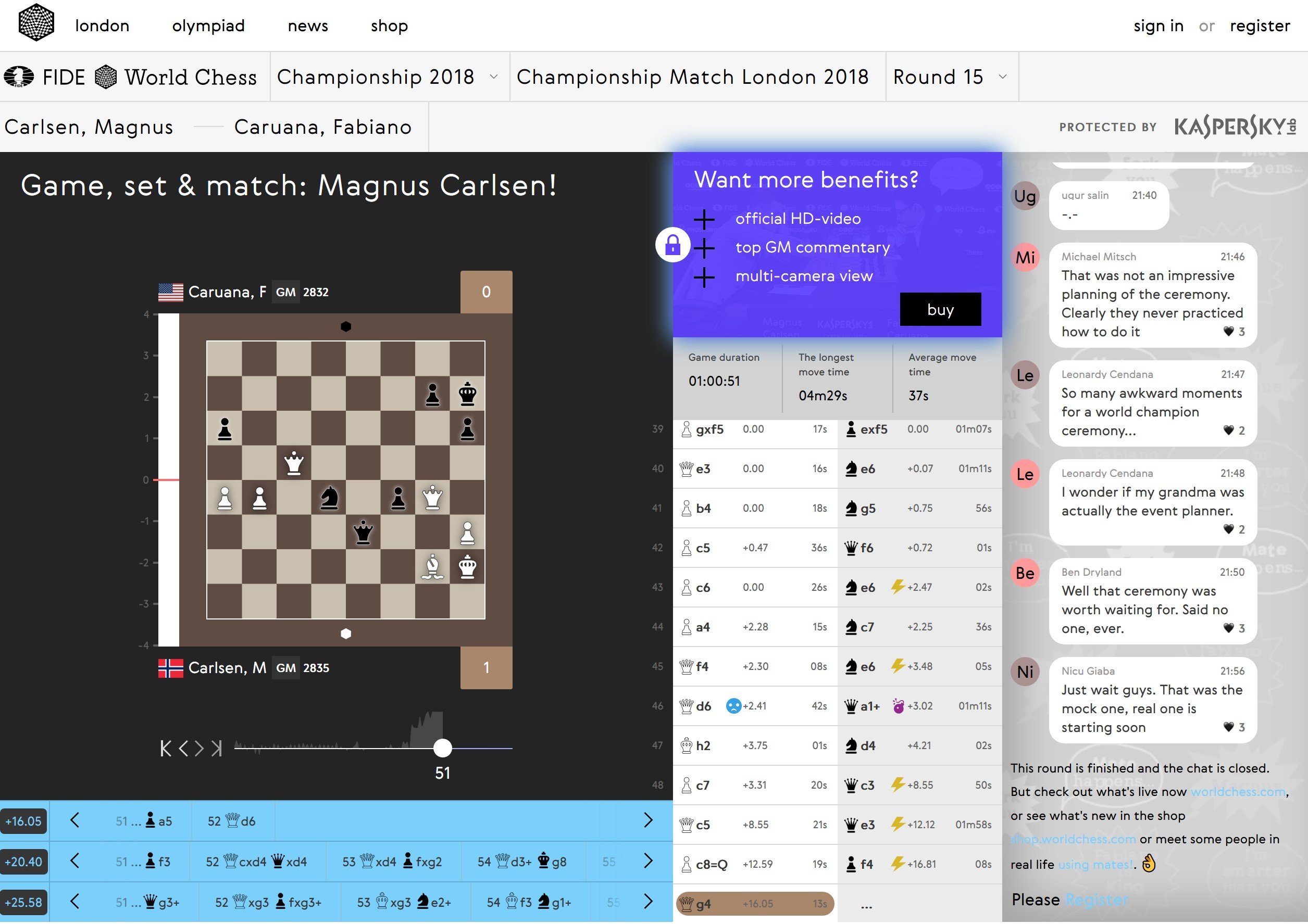 La cosa ha cambiado en el enfrentamiento entre Carlsen y Caruana de estos últimos días. Vivimos en la época de Twitch y de YouTube, y las retransmisiones ajedrecísticas han cobrado una nueva dimensión: eran varias las opciones para hacer el seguimiento —yo me conecté varias veces a WorldChess.com y a Chess.com—, pero lo mejor de todo es que ese seguimiento estaba pensado casi para neófitos. En WorldChess, por ejemplo, una barrita a la izquierda del tablero indicaba si blancas o negras tenían cierta ventaja, pero además encima de ese tablero siempre aparecía una pequeña frase, un titular con el que situarse rápidamente si llegabas tarde a la retransmisión.