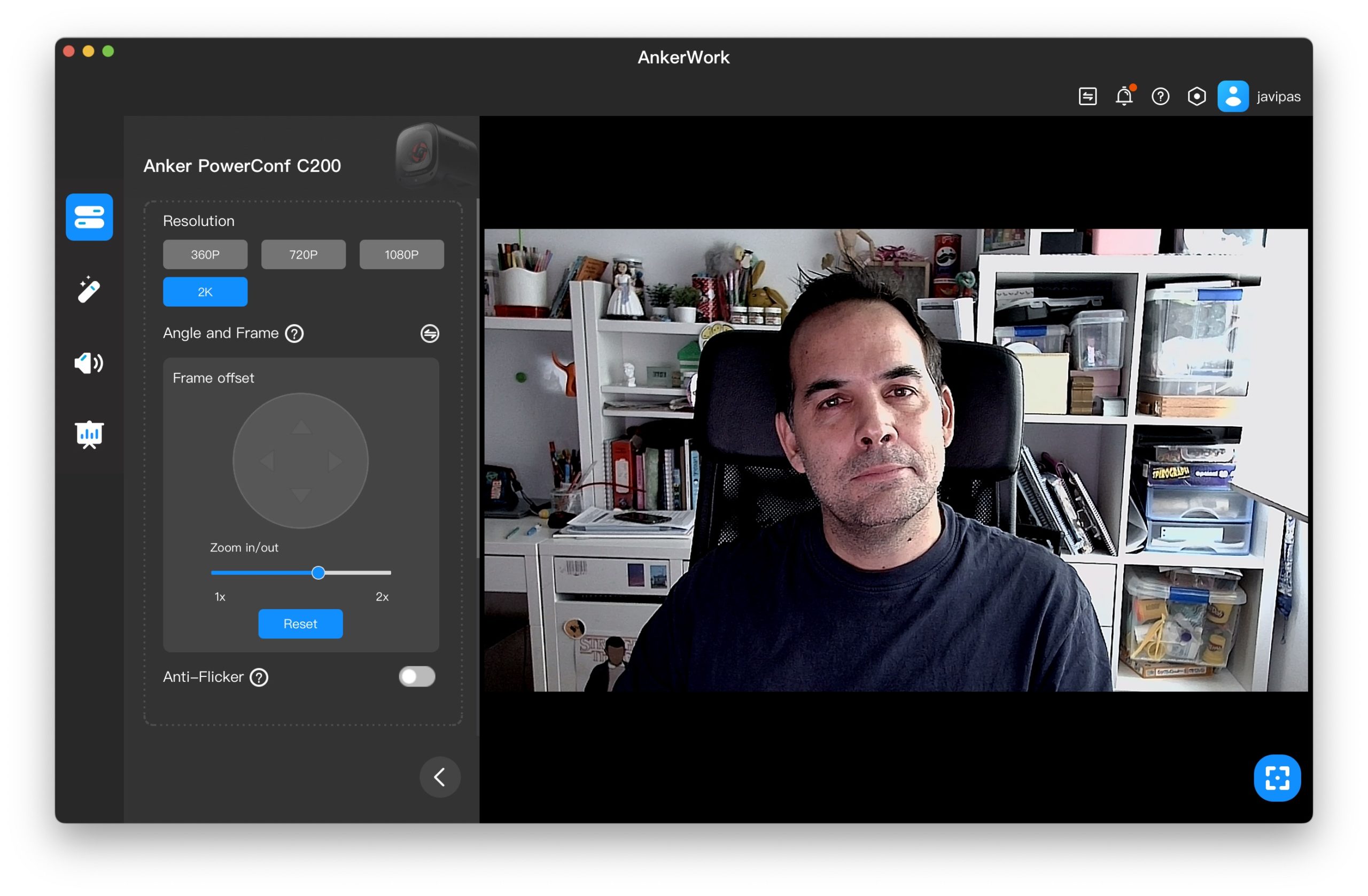 En el caso del zoom, esa configuración avanzada de la imagen permite ajustarlo con una sencilla barra deslizante, pero la otra opción es elegir cualquiera de las tres posiciones de ángulo de visión posibles: 65º, 75º y 95º (un pequeño gran angular). Es también posible elegir la resolución de grabación, y la máxima, 2K, da un nivel de detalle bastante bueno. En mi primera videoconferencia de prueba con mi (ya no tan) pequeña Lucía, me comentaba que se me veía genial y guapísimo, pero claro, lo dice mi preciosa pitufi.
