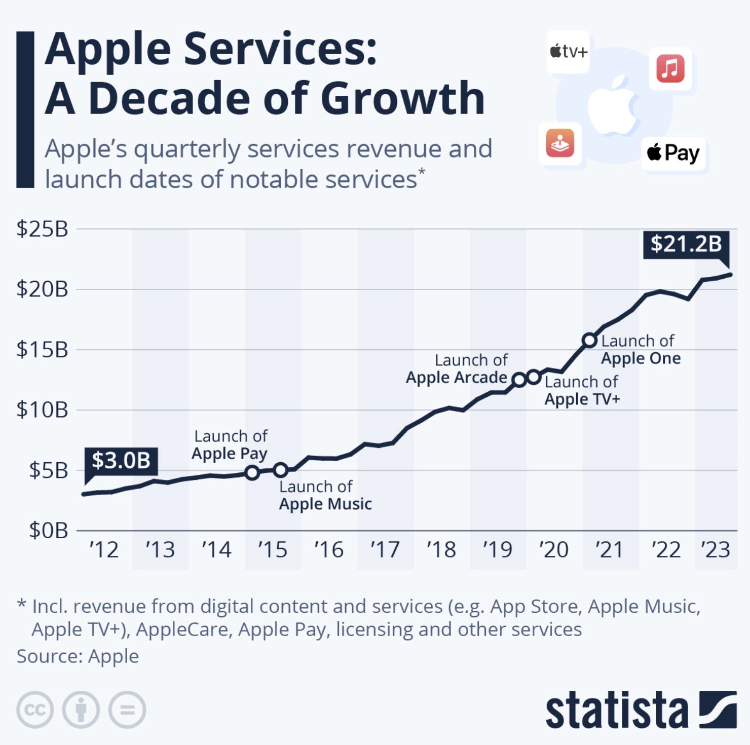 Apple parece estar yendo directamente en esa dirección. No sé si habéis notado que Apple sigue ganando un dineral con los iPhone, pero la división que más crece últimamente no es esa, sino los servicios. Atentos a la gráfica de Statista: