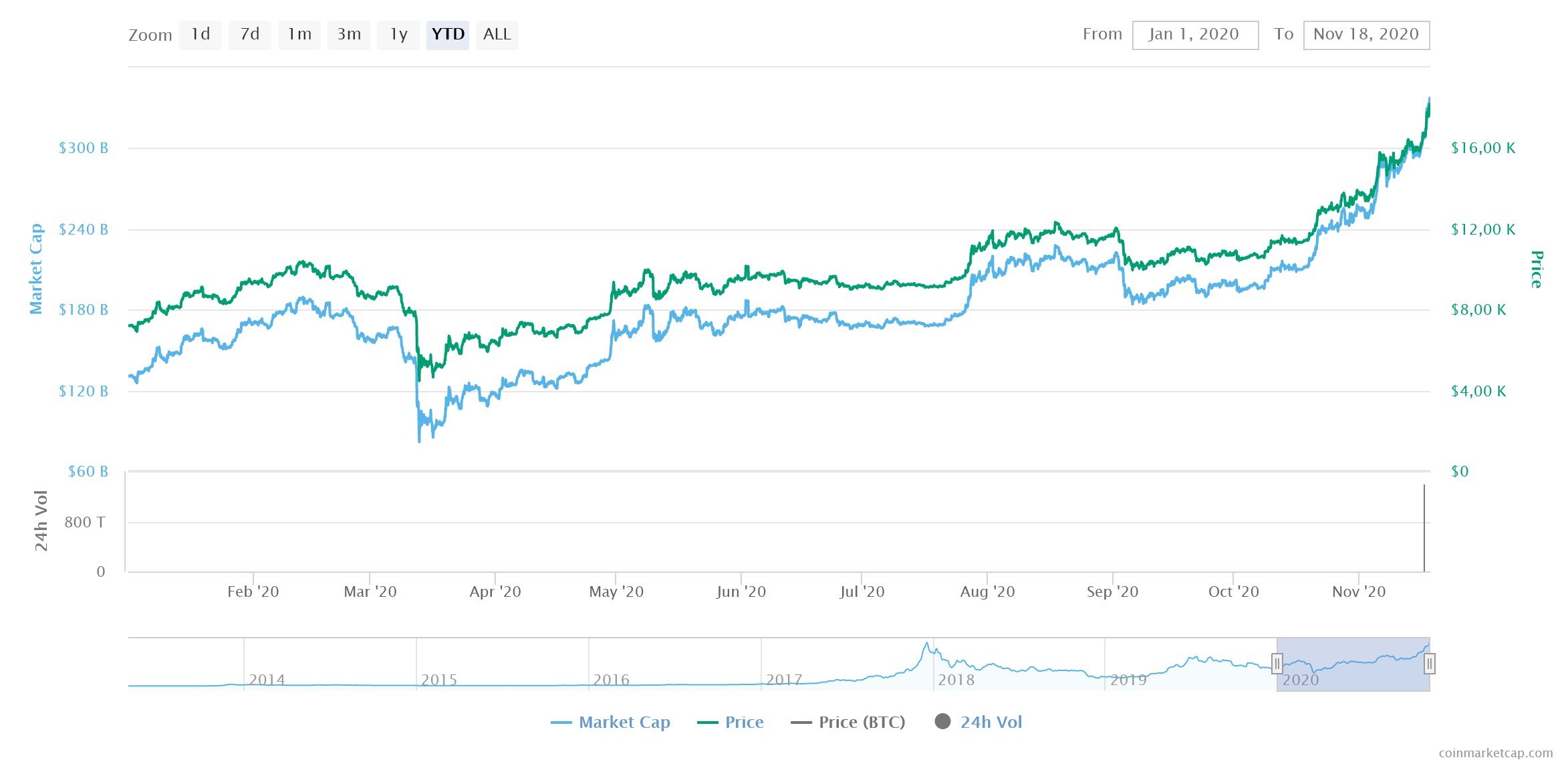 Pero ojo cuidao. Shhh. No lo digáis demasiado alto. Bitcoin está subiendo a lo bestia. En lo que llevamos de mes de noviembre, un 31%. En lo que llevamos de año, un 149%. De aquellos 7.240 dólares de enero de 2020 hemos pasado a los 18.325 que se han alcanzado esta madrugada. Vamos con la gráfica 1.