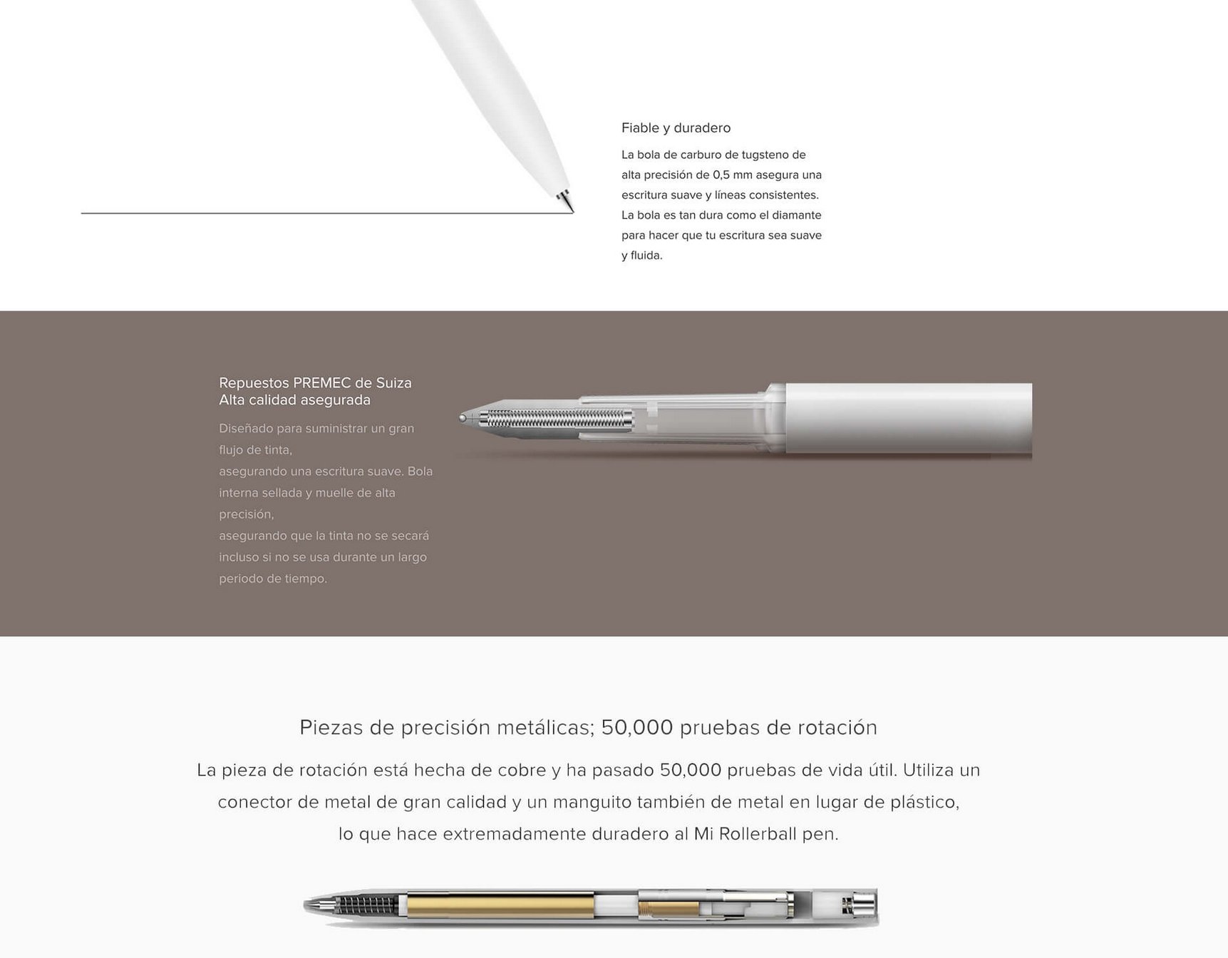 Pero ahí tenéis esa forma de venderlo. Fotos a tutiplen, hoja de especificaciones (puntas de 0,5 mm, eso es ciertamente importante), y diapositivas en las que se habla de todo tipo de cosas absurdas para los no iniciados como yo. Por ejemplo, lo de mencionar sus repuestos PREMEC de Suiza, lo de afirmar que tienen una precisión metálica a prueba de bomba, lo de certificar que los recambios pasan 50.000 pruebas de vida útil o lo de destacar que usan la tinta japonesa Mikuni, que por lo visto es (cómo no) lo más de lo más.