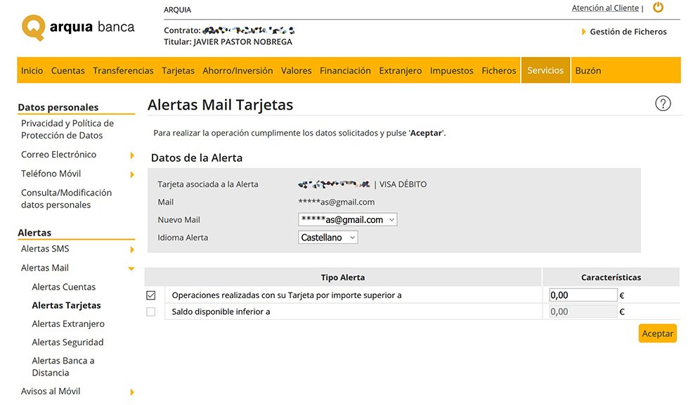 Además, en Arquia hacían algo que ha acabado convirtiéndose en una droga para mí: me enviaban un correo electrónico cada vez que había un movimiento desde mi tarjeta. Como soy de tener el correo constantemente abierto en el PC, aquello me daba mucha tranquilidad, porque confirmaba que los cargos eran los que tenían que ser y no había algún listo utilizando mi tarjeta.