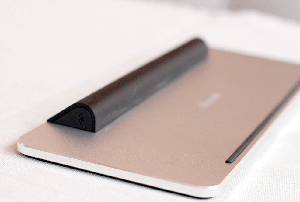Lo de la tapa es un inventazo, por cierto. El material con el que está hecha hace que al doblarlo (tiene un doblez predefinido) aguante sin problemas la tablet (y no es poco aguantar), a partir de lo cual uno puede producir sin problemas.