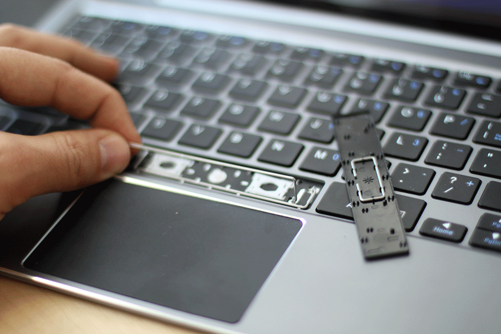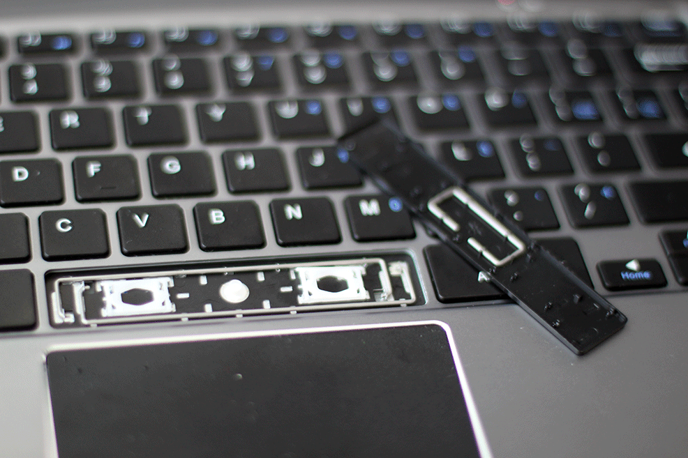 El teclado era tan malo que traté de poner solución a lo malo que era, sobre todo a la principal molestia: esa barra espaciadora que solo funciona si tocas en la zona adecuada. Basta con levantar la tecla haciendo un poco de palanca con un destornillador para comprobar que el sistema de detección de la pulsación lo explica todo. No vi forma alguna de mejorar el comportamiento, así que acabé tomando otra decisión para dar respuesta al problema: comprar un teclado. De eso hablo más adelante, claro.