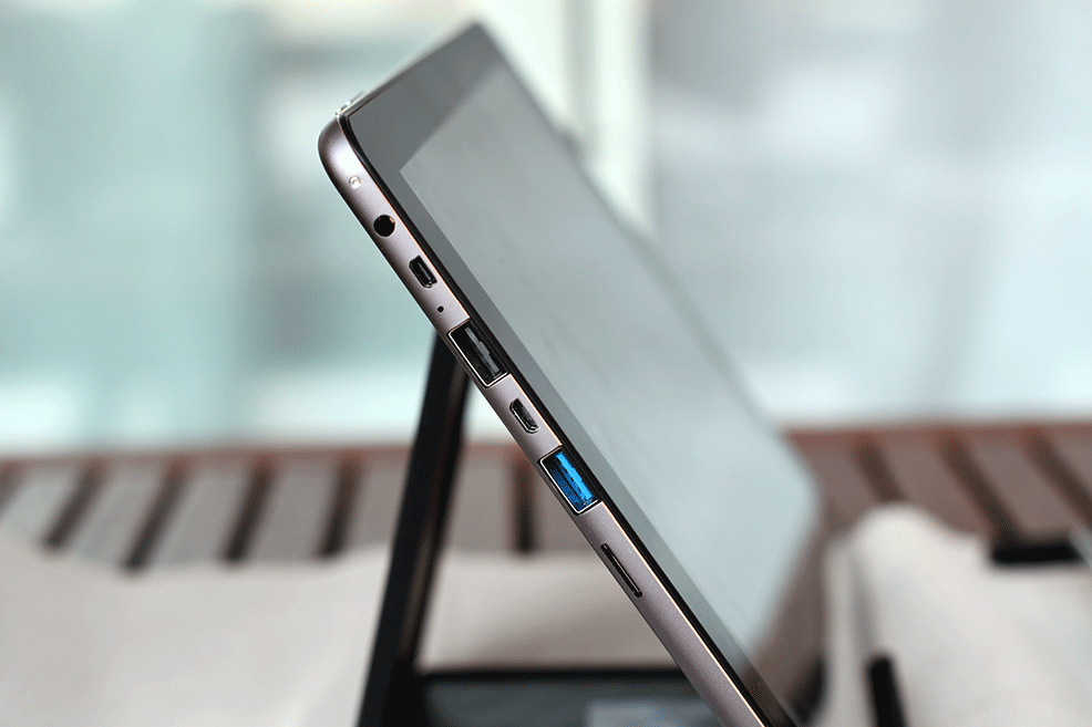 Podría hablar de que los marcos son muy grandes, pero es que los tablets piden marcos grandes para evitar toques involuntarios. En uno de los marcos "cortos" tenemos el botón capacitivo de Windows, mientras que los conectores están en el lateral izquierdo (si miramos la tableta de frente). En la parte superior tenemos botón de encendido y control de volumen, y debajo los contactos que permiten conectarlo a un teclado, además de dos ranuras para la bisagra del citado teclado. Este componente, por cierto, tiene miga, pero hablaré más adelante de él porque se lo tiene ganado.
