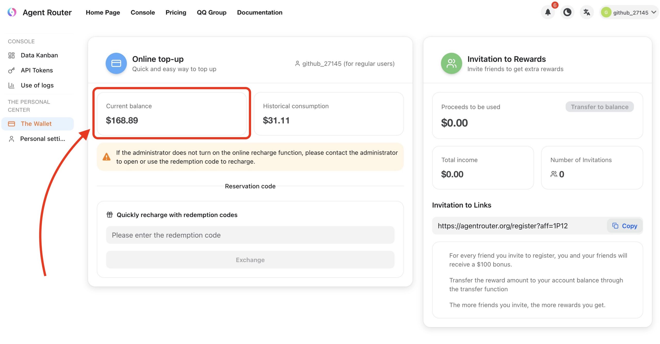 Como ya tenéis la sesión abierta de GitHub en la otra pestaña, la detectará y simplemente os pedirá permiso para "conectar" ambas cuentas. Tras dárselo, veréis inmediatamente cómo en vuestra cuenta de AgentRouter, en el apartado The Wallet a la izquierda (aunque se ve también en otros de esos apartados), hay un "Current Balance" de 200 dólares. Que son justo los que podéis usar con los modelos citados. Aquí pequeño disclaimer: he usado mi enlace afiliado de AgentRouter porque si lo usáis, a mí me llegarán 100 dólares de crédito para poder seguir trasteando. Por supuesto podéis usar el enlace normal de AgentRouter, pero si no os importa, me hacéis un favor :)
