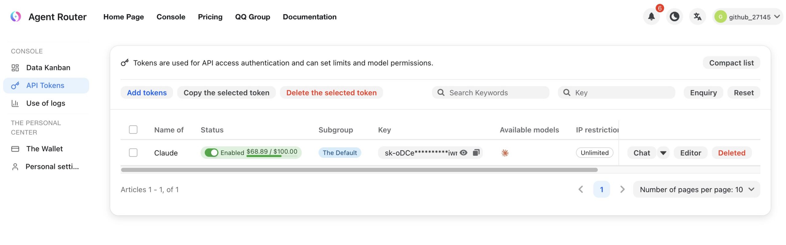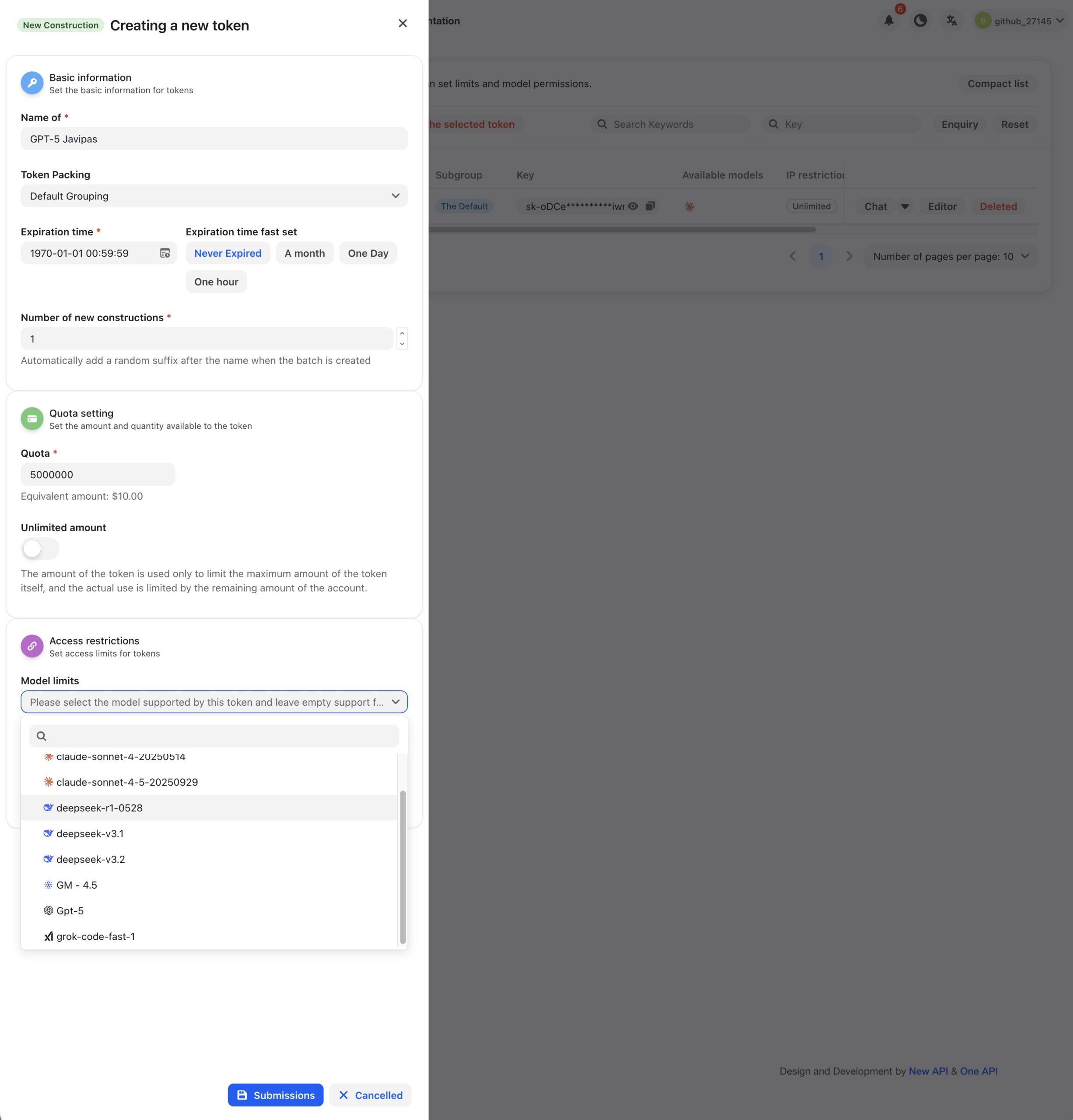 Y listo. Una vez lo hagáis pincháis en "Submissions" (debería ser "Submit", pero ya sabéis...), y a los pocos instantes veréis cómo en la lista de claves de la API token os sale la que acabáis de crear, que podéis mostrar y ocultar, pero que además podréis copiar al portapapeles. Eso es importante, porque lo tendréis que hacer próximamente para poder usar ese token. A la derecha del token, por cierto, aparecen los "Available models" con los iconitos de OpenAI, Anthropic, DeepSeek, etc). Aunque en las imágenes he elegido GPT-5, en realidad no he creado ese token. Esta cuenta la estoy usando solo para trastear con Claude 4.5, que es bastante potente y que no usaría normalmente porque es carete. Quería experimentar con él, así que dediqué 100 de los 200 dólares a una API token que me diera margen de maniobra.