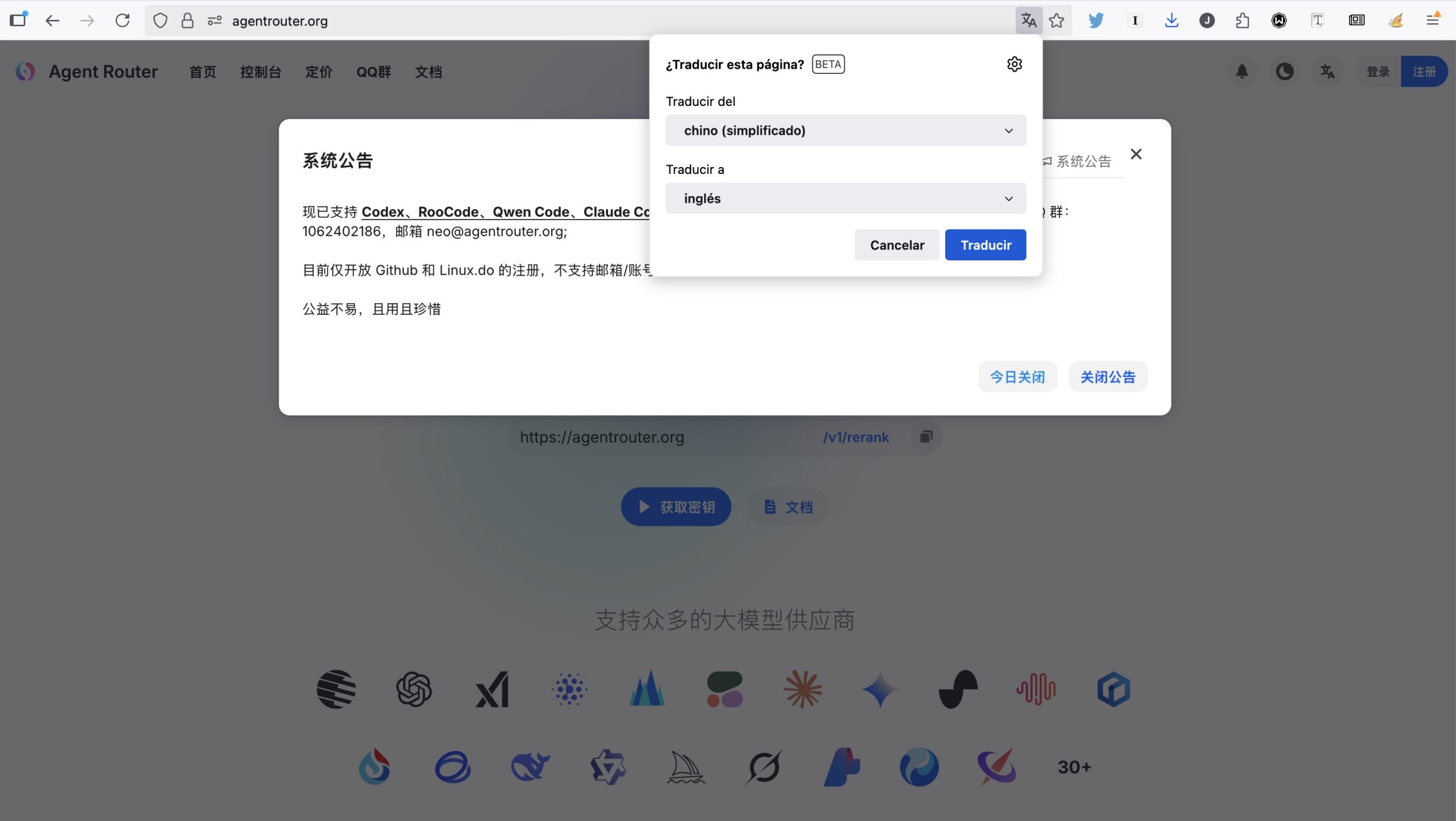 AgentRouter, eso sí (insisto) es una plataforma china, así que puede echar para atrás porque en el navegador no te enteras de nada a no ser que sepas chino. Afortunadamente los navegadores modernos incluyen traductores en tiempo real, así que basta pinchar en el icono de traducción (a la derecha en el campo para escribir URLs) y traducir la web.