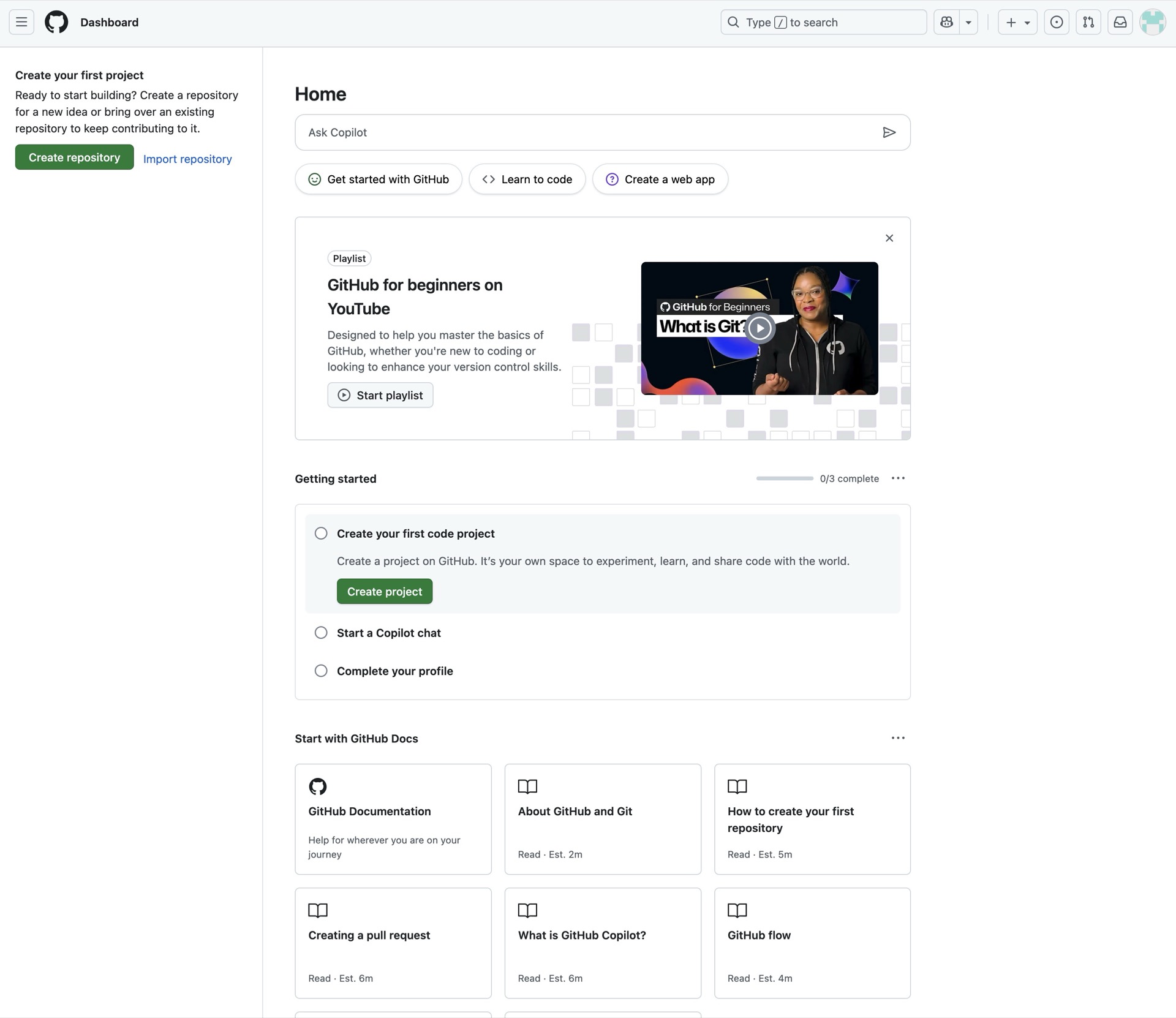 Si queréis probarlo, os explico brevemente cómo. Para empezar, un requisito fundamental: tenéis que tener cuenta en GitHub. Si no la tenéis, podéis crear una rápidamente por ejemplo asociándola a vuestra cuenta normal de Google o Apple, aunque yo crearía una separada solo para esto. Una vez tengáis la cuenta de GitHub creada, logaos en ella y os aparecerá algo como esto: