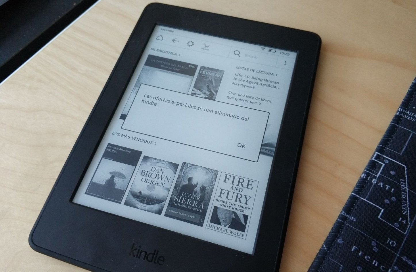 Era de esperar que por ese precio fuera esa edición, pero no tenía claro si los anuncios integrados me molestarían mucho o poco. Y la verdad, me molestan, porque por muy poco que consuma la pantalla, al final cada vez que miraba al Kindle en mi mesilla me encontraba con un anuncio de 6 pulgadas con la última novedad promocionada en libros en descuento o en algún título en oferta.