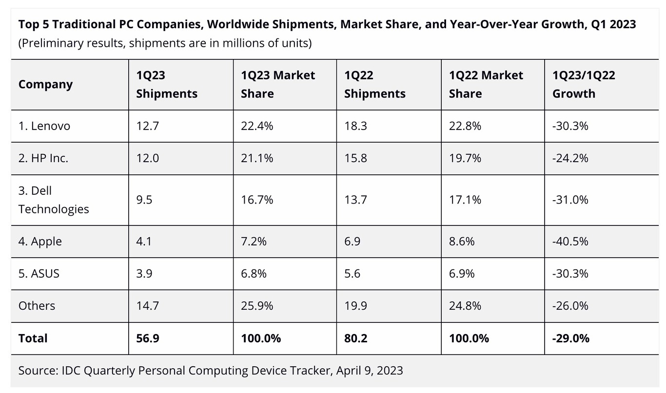 Lo cierto es que no querría estar yo en la piel de los directivos de Lenovo, HP, Asus o incluso Apple. Lo conté hace unos días: la empresa de Cupertino, que hasta ahora había aguantado el chaparrón, cae a plomo: nada menos que un 40% en primer trimestre de 2023 respecto a las ventas del mismo periodo de 2022.