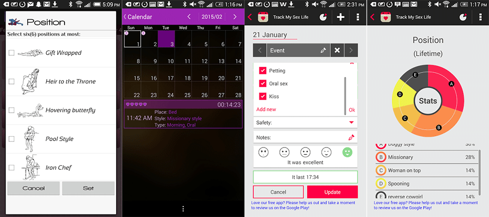 Esa cuantificación está saliéndose un poco de madre y ahora hay opciones de llevarla a otros ámbitos casi tan absurdos -mi opinión, que conste- como el original. Entre ellos me ha sorprendido el que nos permite cuantificar nuestra actividad sexual, algo de lo que hablaban en uno de esos artículos imperdibles que he encontrado en The Kernel. Allí el autor contaba en tono simpático -difícil afrontarlo de otro modo- cómo había propuesto a su mujer lo de ir registrando sus encuentros para poder trabajar con datos reales. Dicho y hecho, porque tras unos días pudo emitir su juicio sobre tres aplicaciones para Android que permiten registrar esos datos y además sugerir nuevas posiciones por si uno quiere ponerse creativo. Por supuesto está el apartado de la valoración, y en una de las apps tras cada encuentro había que valorar el grado de satisfacción del acto, que probablemente nunca baje de 4,5 estrellas sobre 5 porque ya se sabe, todos somos unos fieras en este apartado.