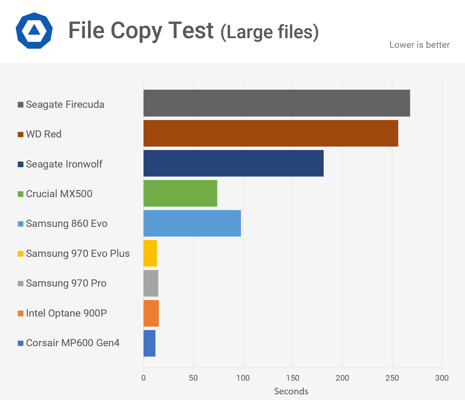Esas dos últimas gráficas dan otra idea de cómo afectan las distintas unidades a escenarios como el de la carga de juegos —la mitad de tiempo, pero no esa carga instantánea de la que hablan Microsoft y Sony, veremos— o la copia de archivos, que lógicamente se beneficia a tope del ancho de banda de los estándares PCIe 3.0 y sobre todo 4.0.