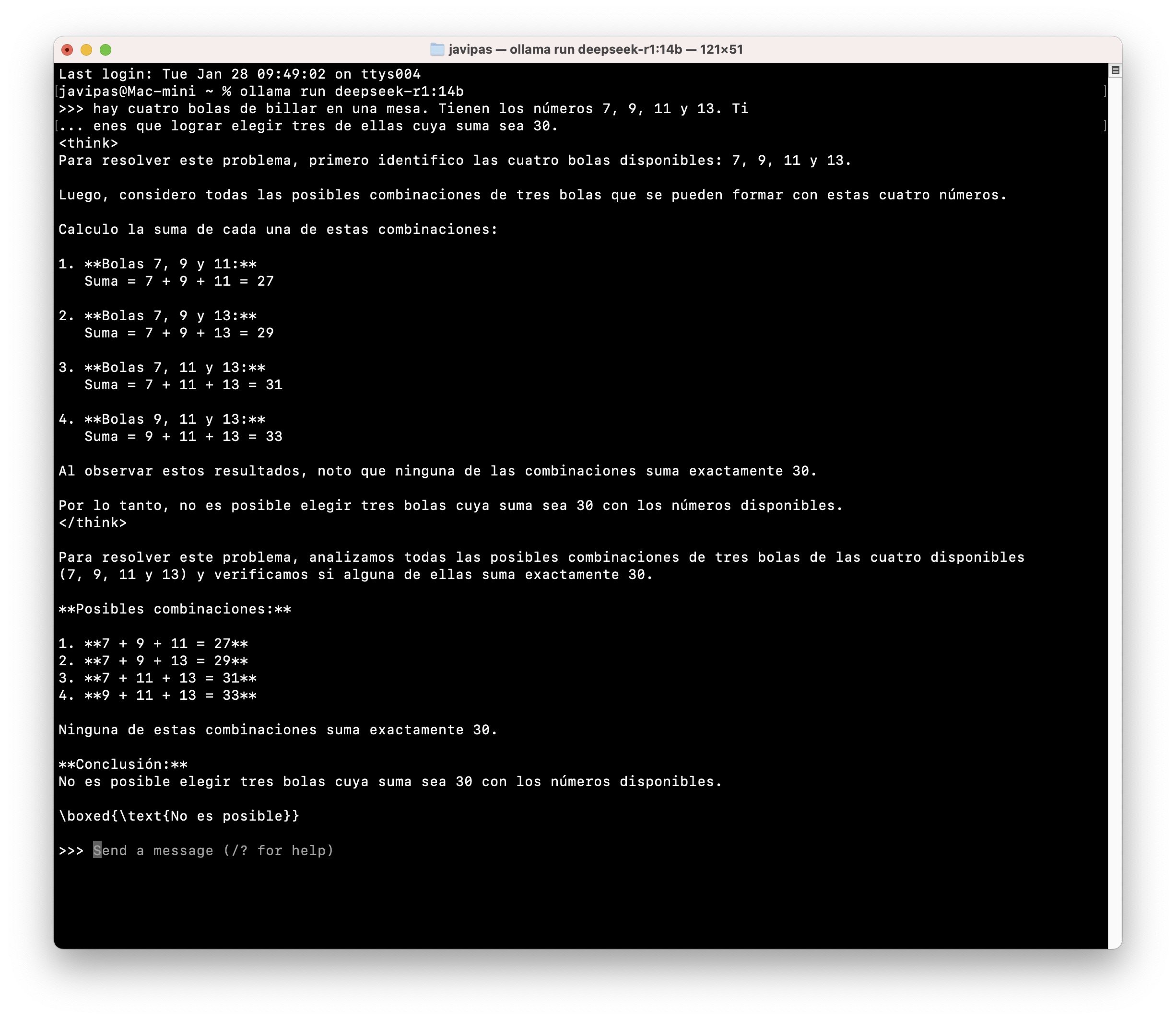 Pues no. Hay versiones "pequeñitas" para equipos como el mío que se pueden usar con plataformas como Ollama y, como complemento, AnythingLLM (poner en marcha esto es una chorrez, aquí hablan un poco de ello). Es posible usarlo para todo tipo de cosas, pero a mí me gusta hacerle la puñeta y ponerle acertijos como el de las bolas de billar que sí solucionó por ejemplo Gemini 2.0 Flash Thinking.
