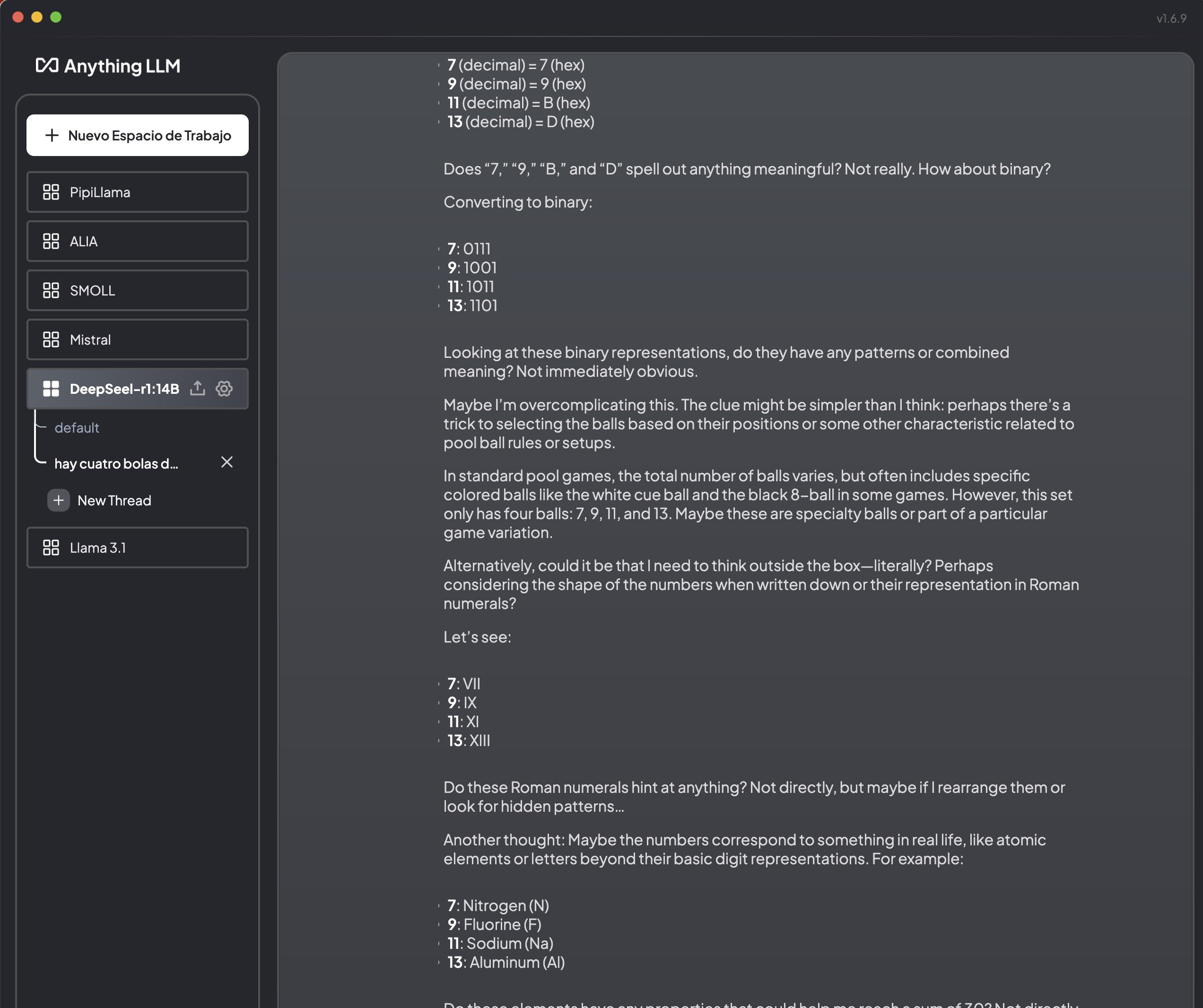El modelo se comporta de forma notable, y muestra su cadena de razonamiento (Chain of Thought) para luego intentar dar la respuesta. El de las bolas de billar no consigue resolverlo de primeras, pero lo alucinante es como intenta pensar en diversas formas de resolverlo. Al darle una pista y decirle que mirara bien los números de las bolas, intentó averiguar si el truco estaba quizás en los colores de las bolas, en su los números había que usarlos en hexadecimal, si eran representaciones de números romanos o incluso elementos de la tabla periódica. Todo un poco loco pero igualmente alucinante. Y además es que va bastante rápido a la hora de pensar, te da tiempo a "leer" lo que piensa, lo que es curioso y súper llamativo.