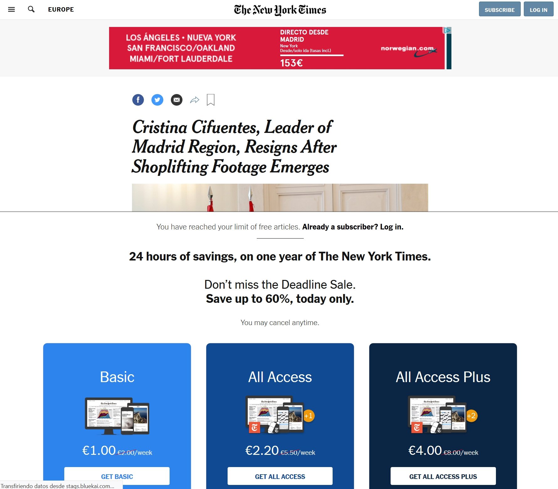 Esa cifra es hoy por hoy impensable para cualquier medio en nuestro idioma, pero la dimensión del NYT es enorme y eso hace que otros, como digo, estén comenzando a mascar el movimiento. En The New York Times van más allá y están limitando aún más el acceso a sus contenidos: antes podías ver 10 contenidos al mes, y ahora son 3. Para quien ama el producto eso puede ser efectivo a la hora de atraerle a la versión de pago, pero a quien lo lee de forma ocasional "le escupe". Lo comentaba en Twitter: