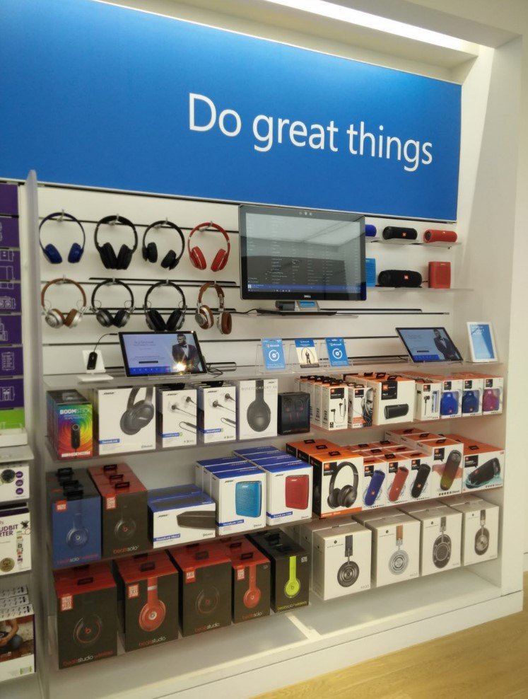 Me sorprendió ver una sección de auriculares con una parte para los Beats, y también me sorprendió no ver ni un Lumia. A lo mejor no me di cuenta, pero yo no los vi. Cero. Ni uno. Los dependientes, eso sí, súper sonrientes. Eso es algo que me encanta de Estados Unidos, que el sector servicios suele tratarte bien incluso en tiendas en las que -que yo sepa- lo de las propinas no es lo usual. Quiero decir que no te atienden bien por la propi. Te atienden bien porque les han enseñado que eso es lo adecuado. Lo más normal en nuestro país, tanto en hostelería como en tiendas, es que quien te atienda o lo haga con cara de perro o lo haga mirándote primero por encima del hombro como diciendo: "no eres digno de comprar aquí".