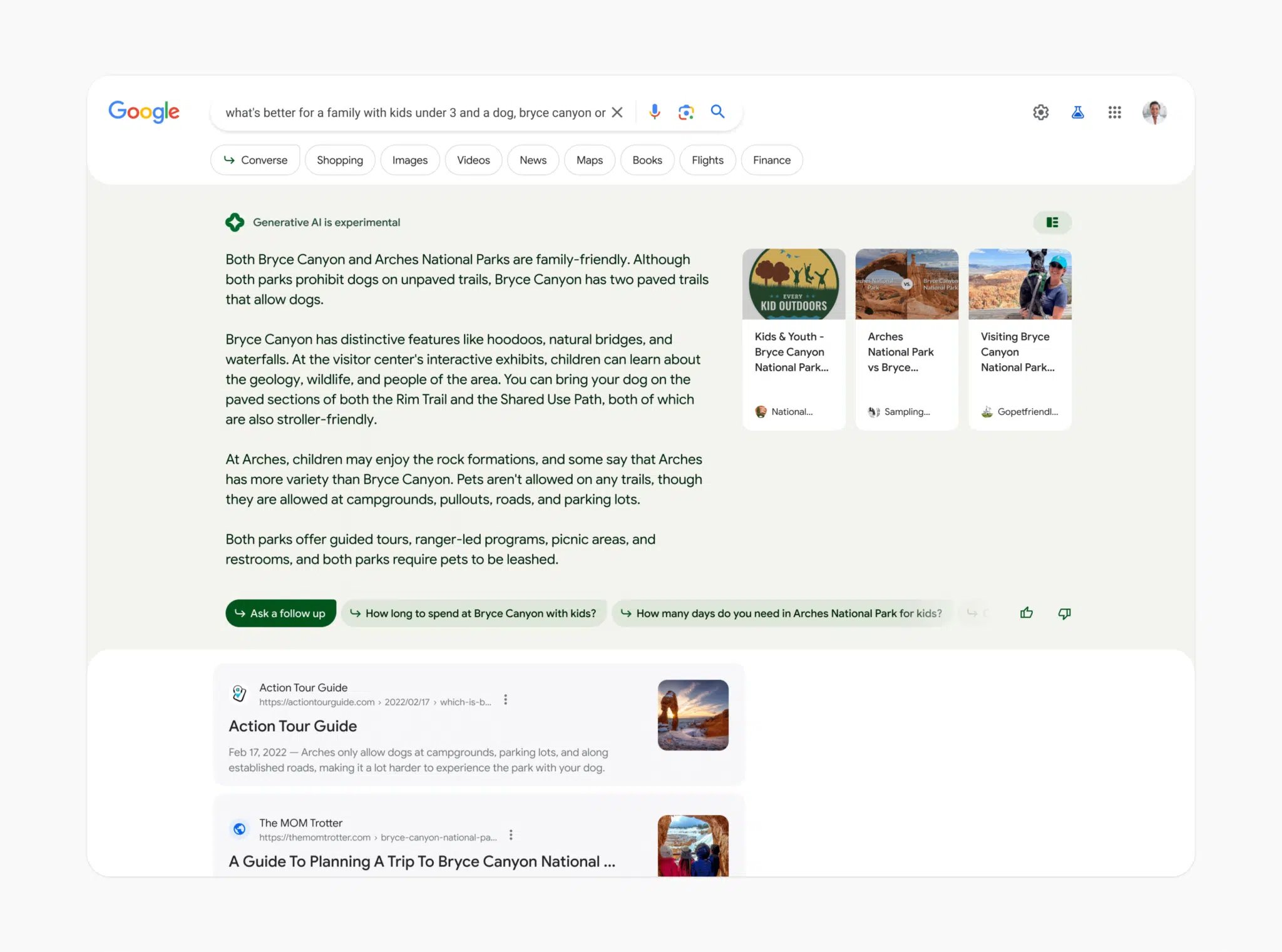 Bing Chat separa la experiencia del chatbot de la del buscador tradicional. O eliges uno, o eliges el otro. Es cierto que luego Bing Chat te ofrece enlaces que se abren en el navegador como si fueran resultados de búsqueda, pero como digo la separación es un poco más estricta. Con SGE la cosa está un poco más integrada, y lo que podemos esperar de la interfaz es algo así: