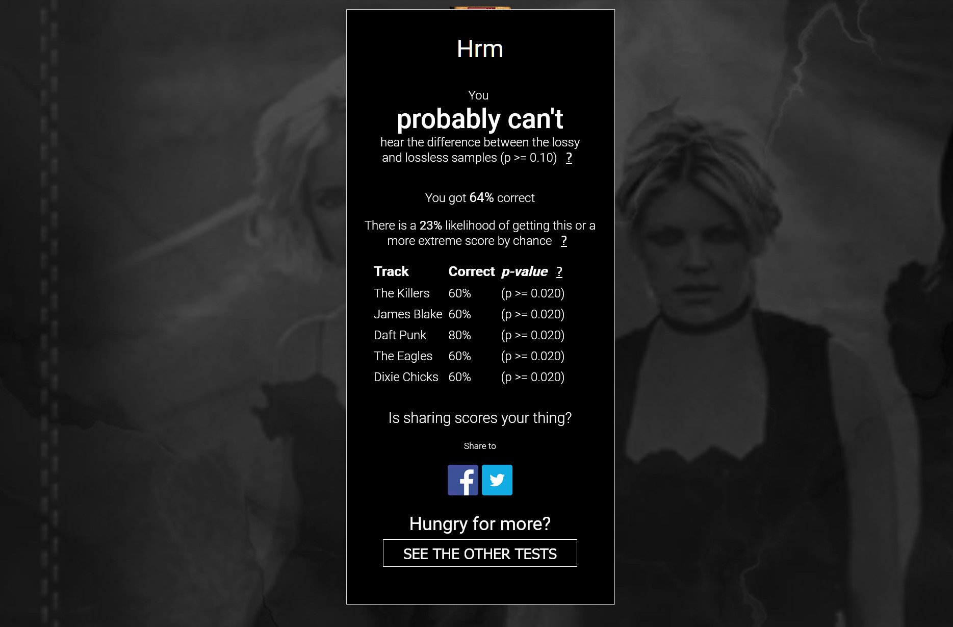 Tras las pruebas, llegó el veredicto. El servicio le indicó a JaviPas con un claro mensaje que "probablemente no era capaz de notar la diferencia entre las muestras sin compresión de las de con compresión". Había acertado en un 64% de los casos, pero eso no sonaba a oídos normales. Eso sonaba a oídos de corchopán.