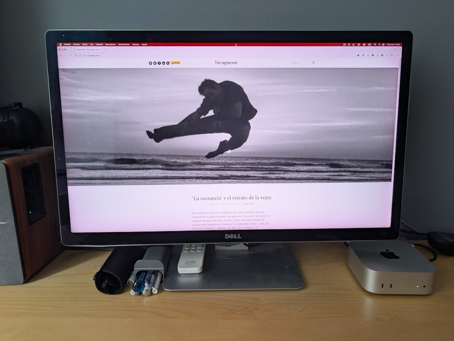 De lo demás, una sola e importante pega. El conector de auriculares está en el frontal, y eso afea el aspecto del equipo al conectar el cable que va a mis altavoces. Sé que puedo girarlo para que se vea menos, pero el frontal del equipo está para colocarlo así. Es una pequeña chorrez, y de hecho leí en algún lado que el puerto de auriculares no es especialmente recomendable para conectar unos altavoces. Lo ideal, según parece, es comprar algún adaptador de USB-C a minijack con DAC integrado. Igual me hago con uno, aunque solo sea por evitar el problema estético.