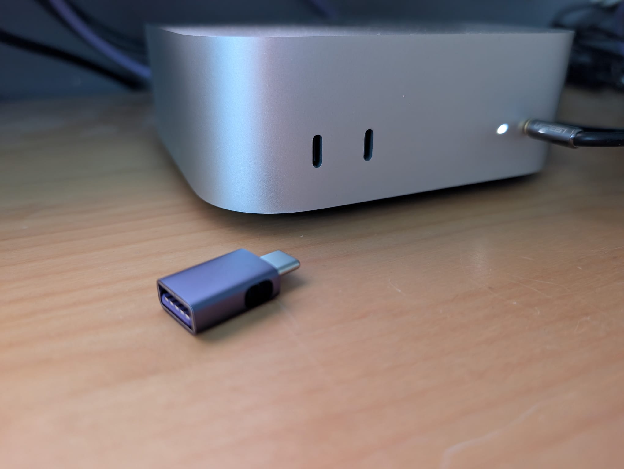 Que no haya puertos USB-A también está resuelto: hace unos días compré unos adaptadores de USB-C a USB-A (5,99 euros por tres) y como uso un Logitech K800 y el receptor es USB-A lo tengo conectado a uno de esos adaptadores en la parte trasera. Todo estupendo por ahí.