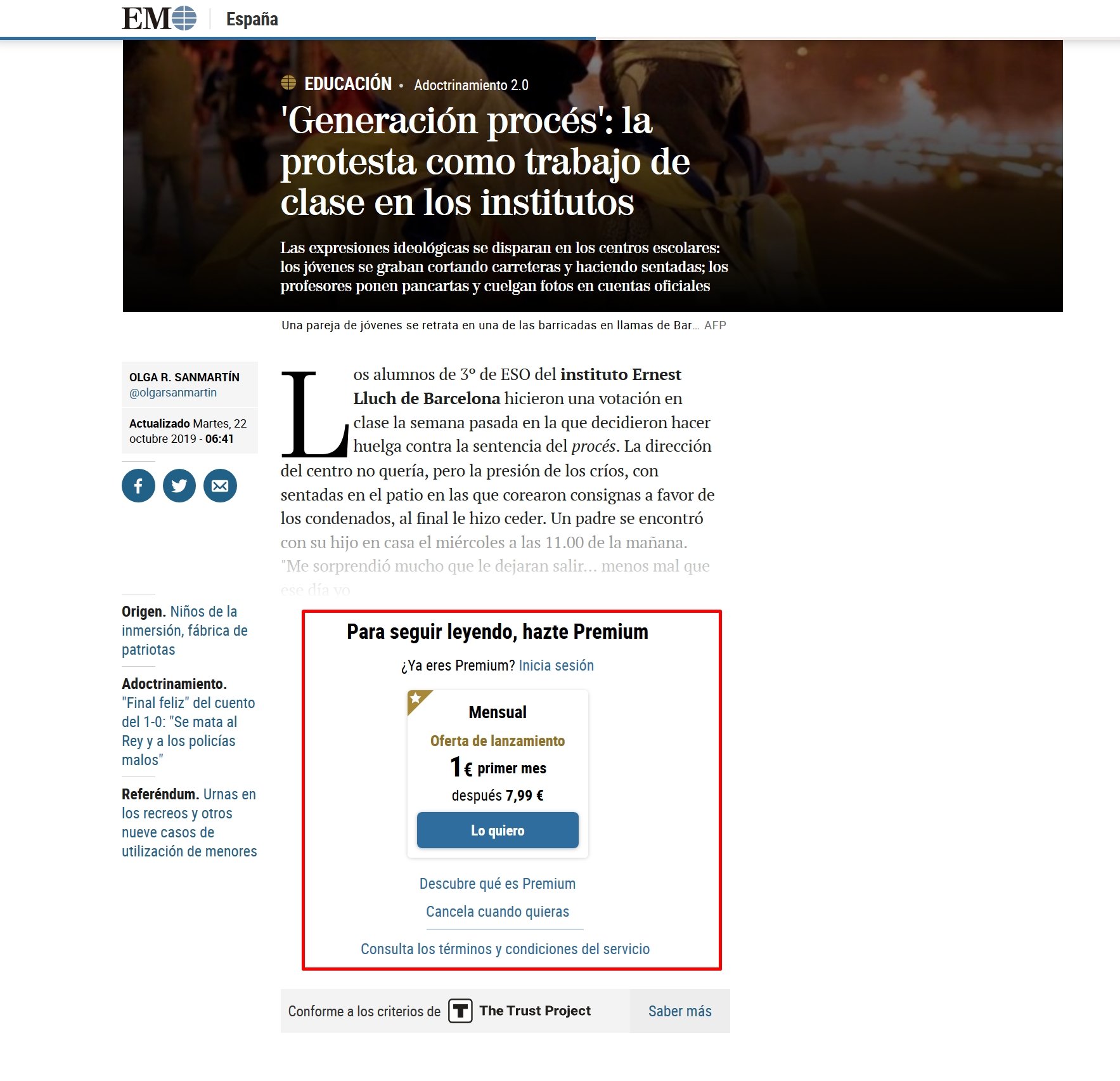 En 2019 ya hay unos cuantos no generalistas en el ámbito tecnológico/económico que lo han hecho o que ya han consolidado esa estrategia (Wired —que analizaba el proceso un año despué sde lanzarlo—, Bloomberg, TechCrunch, Quartz, The Information, MIT Technology Review, The Atlantic), y ahora parece que el experimento se reactiva en nuestro país, porque como se rumoreaba El Mundo ha activado su muro de pago, aunque de una forma curiosa.