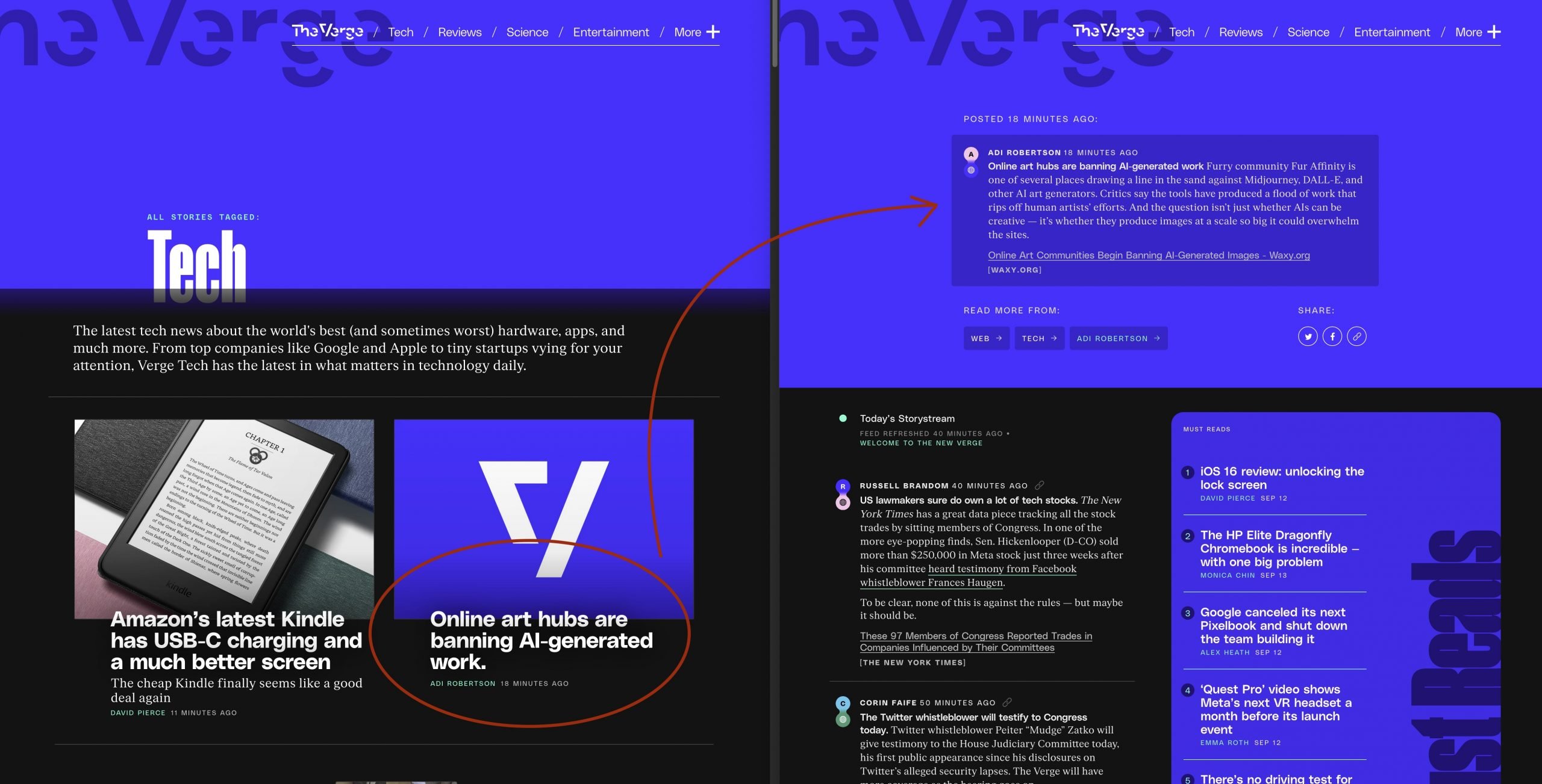 Actualización (14/09/2022, 12:21): no puedo por menos que enlazar el fantástico análisis que Antonio ha hecho en Error500. Su visión es fantástica y convincente. Efectivamente The Verge tenía que arriesgar y lo ha hecho. Y me da a mí que poco a poco nos va a convencer a todos de que este enfoque era el adecuado. El diseño puede rechinar, pero igual esto es un punto de inflexión y todos los medios acabamos enlazando a otros porque queremos que la gente encuentre esos enlaces desde nuestra portada.