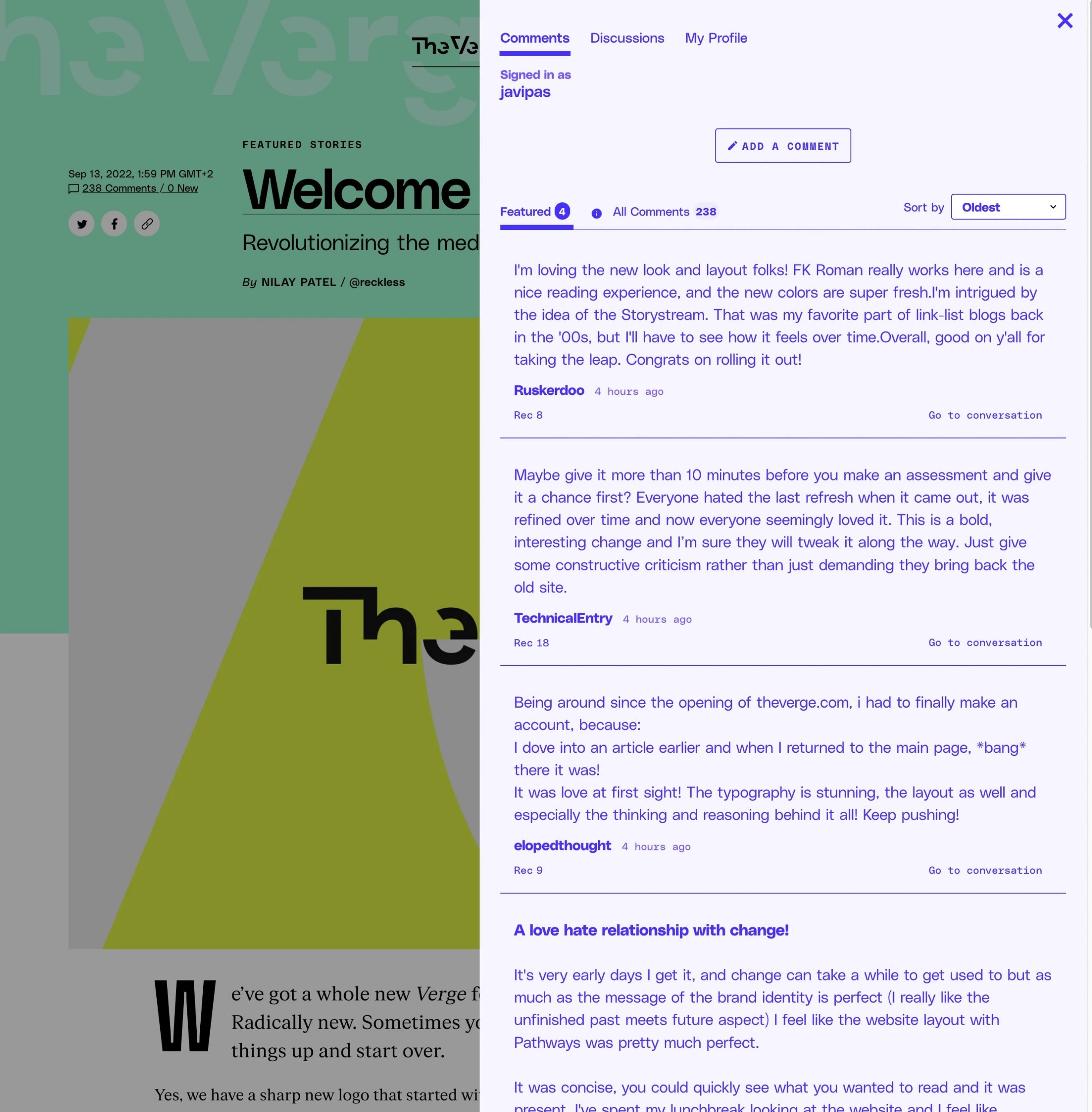 - Comentarios, el horror. Bastante pereza da ya leer comentarios como para que te los presenten de esta guisa. En The Verge el nuevo sistema, llamado Coral, hace que al pinchar en comentarios (si en cuentras el enlace, que no se ve muy bien) ese bloque para leer y comentar desplace hacia la izquierda el contenido principal o lo cubra por completo en el móvil. En mi caso, que leo la mayoría de veces en pantalla dividida, el resultado es una caca, porque tapa solo la mitad del contenido. No solo eso (I): los colores y tipografías no funcionan para mí y hacen poco legibles esos comentarios. No solo eso (II): dejan organizar por destacados, más antiguos o más nuevos, pero muestran de principio los destacados, que lógicamente suelen ser positivos (al menos al hablar de ese rediseño). Una vez más usabilidad y legibilidad empeoran frente al antiguo enfoque, más clásico.