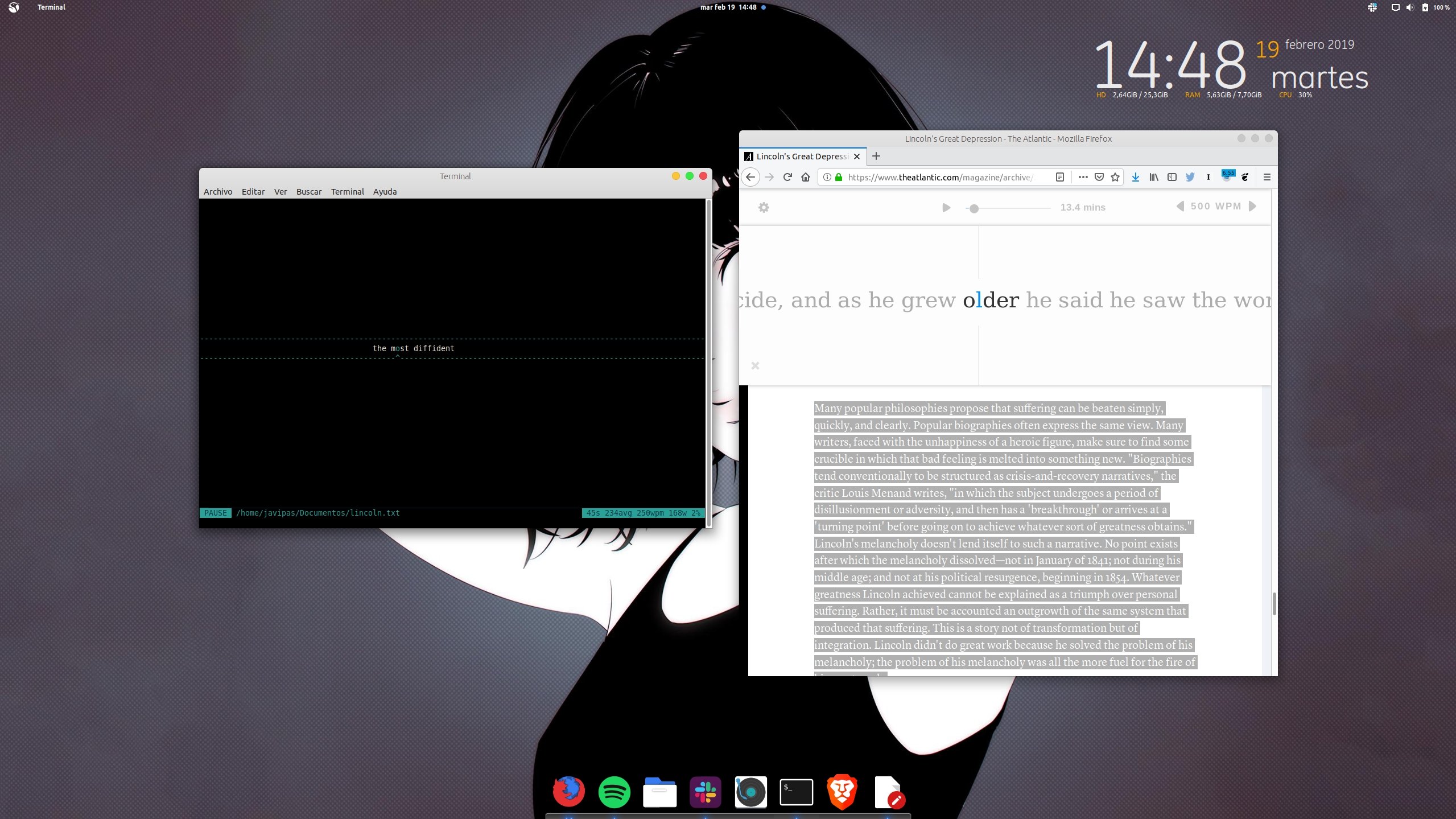 ¿Lo es? Es lo que he vuelto a comprobar con un experimento hoy. Todo partía de una herramienta para la consola de Linux que uno puede usar como un lector de este tipo para cualquier texto. He visitado Longform.org, he seleccionado este artículo sobre Lincoln, he copiado y guardado el texto como txt y tras compilar la herramienta he hecho un 'fltrdr lincoln.txt' para probar el invento.