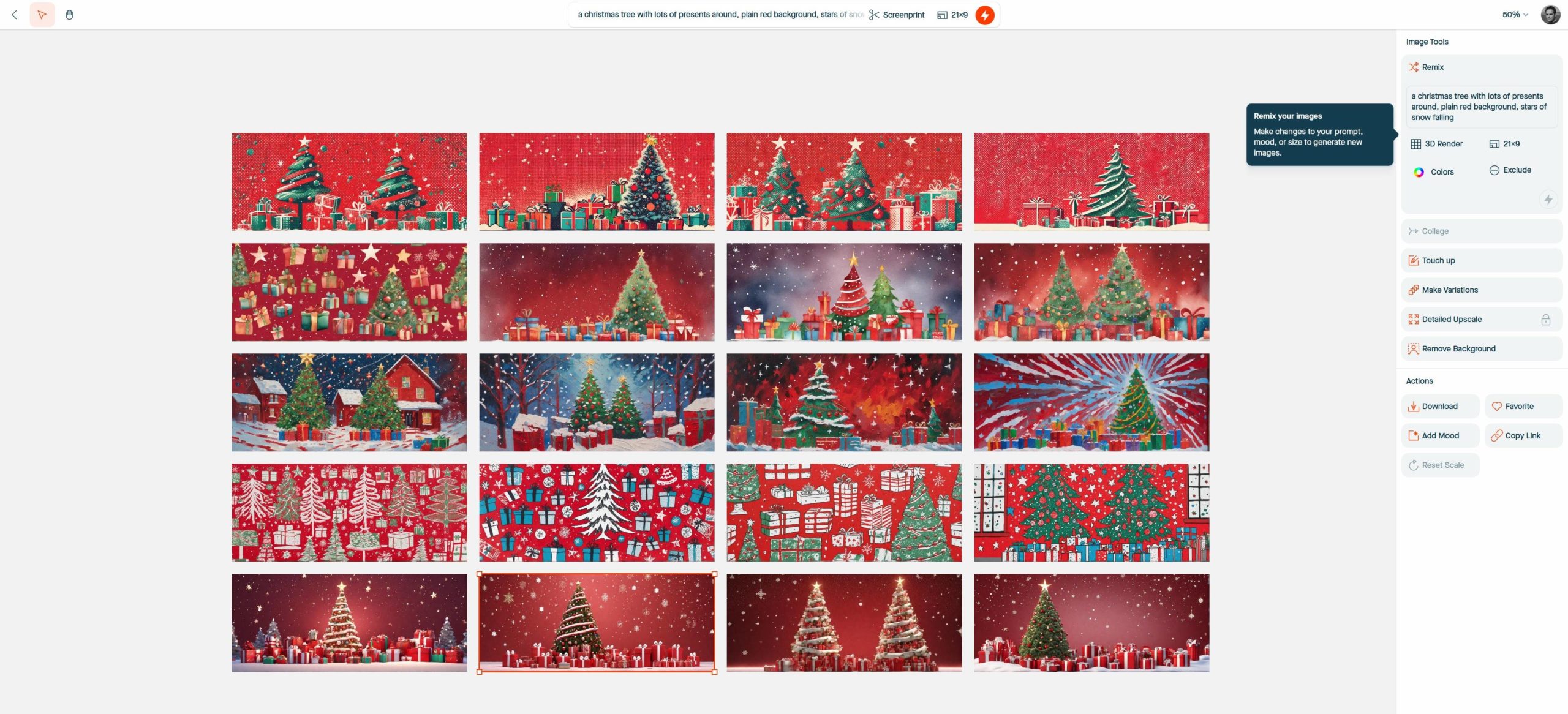 Paso 1: Con Visual Electric, un nuevo generador que está gracioso por cómo permite jugar con estilos y te pone todos los resultados en un lienzo (Canvas) le he pedido un árbol con fondo rojo y regalos alrededor y nieve cayendo en forma de estrellas. Tras jugar con varios estilos, me he quedado con el último.