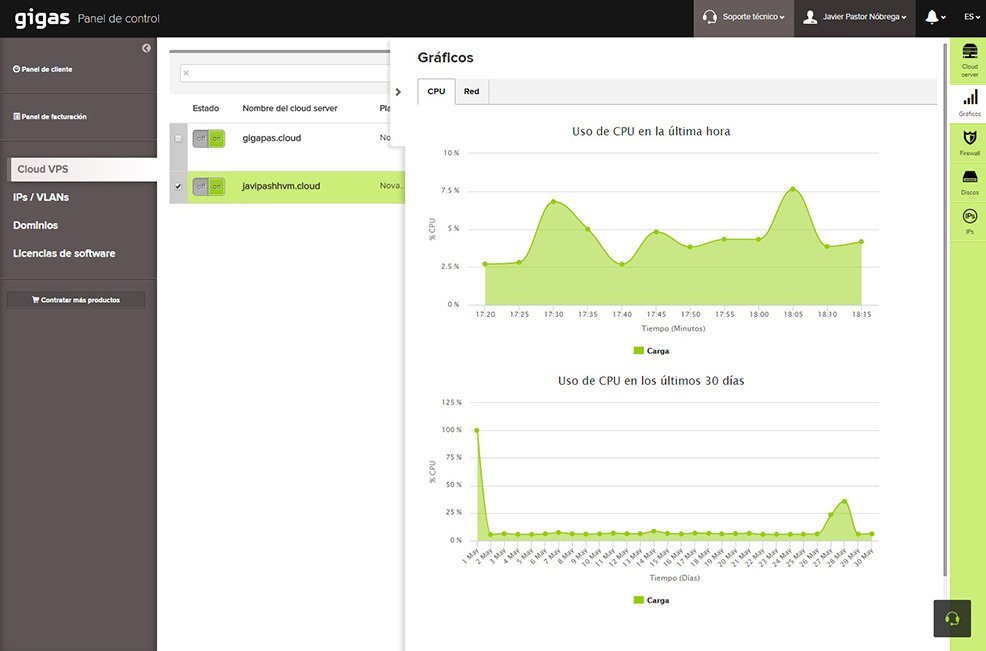 El caso es que no puedo más que hablar bien de Gigas porque es una empresa que tiene una cosa fantástica: no molesta nada. No están todo el día mandando promociones y ofertas, y lo curioso y sorprendente es que su política a la inversa es estupenda: cuando he tenido algún pequeño problema —soy un sysadmin algo descuidado—, siempre han estado ahí para resolvérmelo. En la imagen por ejemplo se ve ese auricular en la parte inferior derecha para que puedas chatear con ellos cómodamente, que es lo que se lleva ahora.