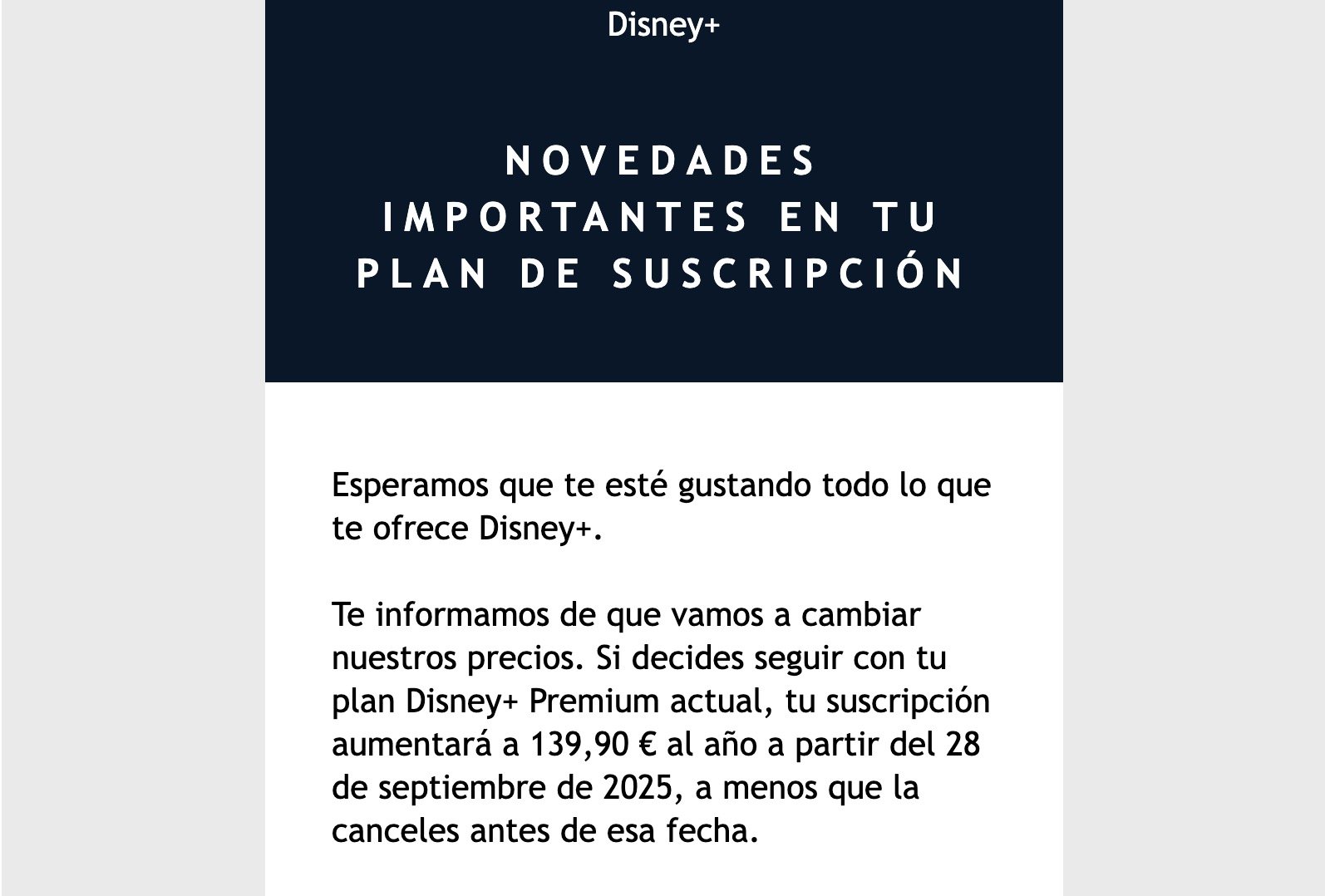 Ayer por la tarde recibí un mensaje en mi buzón de correo electrónico. El mensaje tenía como remitente a Disney+ y se titulaba "Novedades importantes en tu plan de suscripción". Durante un suspiro pensé que quizás iban a premiarme por ser cliente desde hace cinco años, pero no.