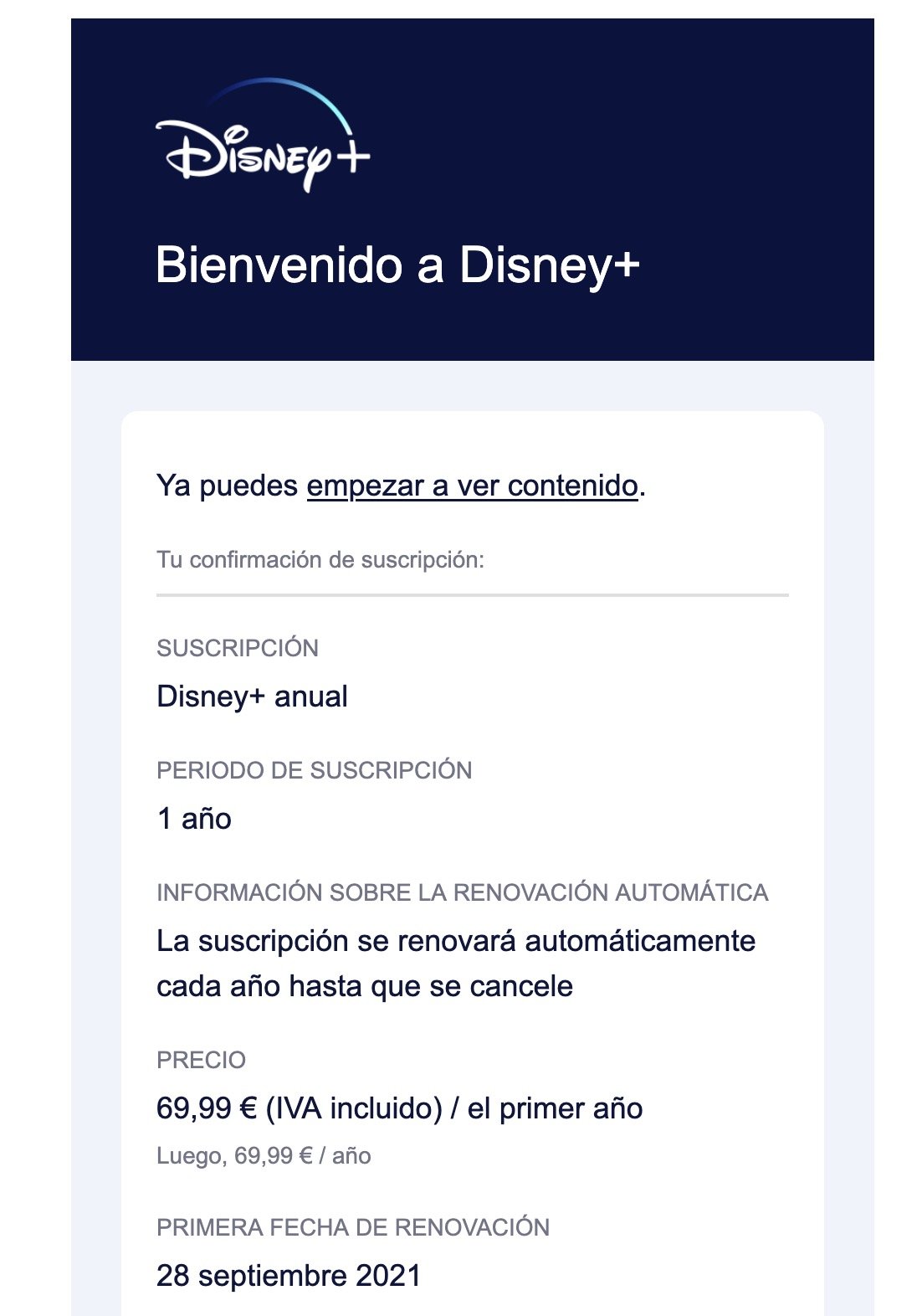 Consultando mi correo y buscando correos del pasado, he visto cómo me apunté por primera vez a Disney un 28 de septiembre de 2020, hace casi cinco años. El precio de entonces era de 69,99 euros al año.