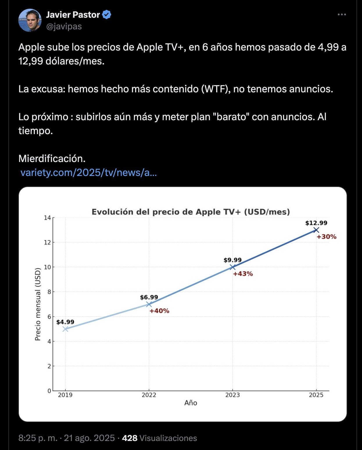 Pero este mensaje no va solo para Disney+. Va para todas. Apple TV+, por ejemplo, subió sus precios el otro día y lo comenté en Twitter (X). En estos seis años el precio del servicio ha pasado a ser de 4,99 dólares al mes a 12,99 dólares. Un 160,32% más.