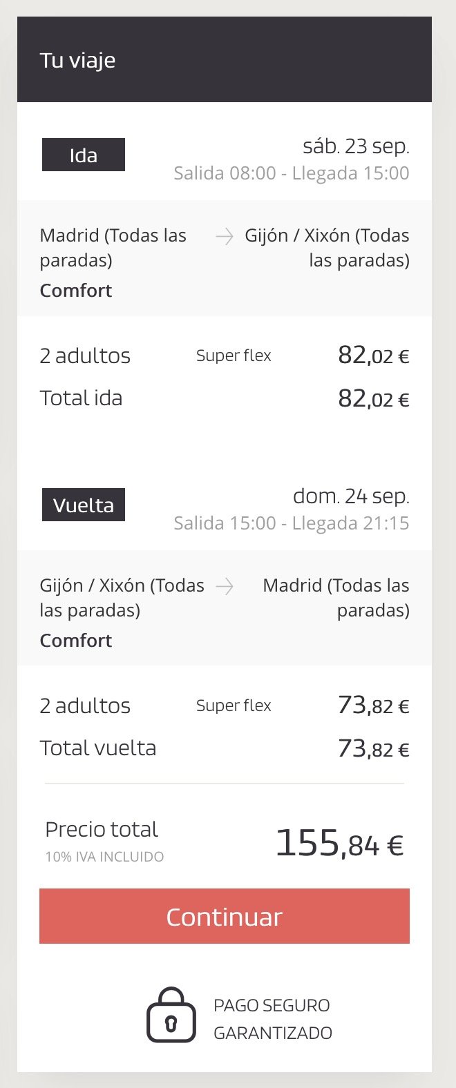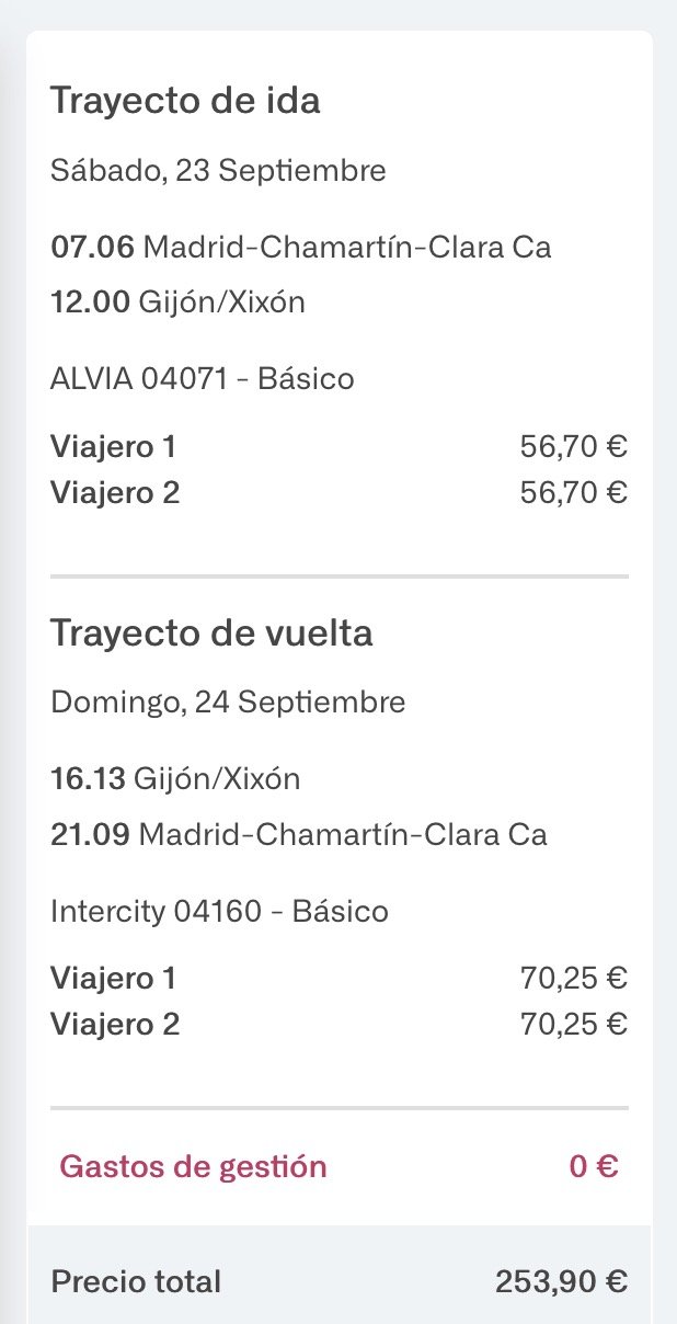 - En tren: el objetivo es aprovechar el fin de semana, así que toca salir pronto el sábado y volver después de comer el domingo. Tras mirar un poco en Renfe (no veo alternativas) la opción era clara: coger un tren a las 7:06 AM el sábado y la vuelta de las 16.13. Se tarda al final lo mismo que en coche y es cierto que no conduces tú y puedes disfrutar del trayecto, pero el coste de los billetes para una pareja es absolutamente ridículo: 253,90 euros.