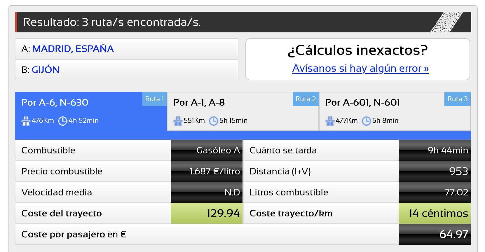 - En coche: es posible calcular el coste del viaje de forma bastante exacta con calculadoras como la de DieselOGasolina, que te pregunta origen, destino, y luego aplica precios actualizados de los combustibles, consumo de tu coche (en nuestro caso, 7 l a los 100 km, quizá algo menos en carretera), y uso de aire acondicionado y equipaje. Con esos datos obteníamos un coste de 127,66 euros entre ida y vuelta y un tiempo de trayecto de 9 horas y 27 minutos (4 h y 43 min por cada aprox).