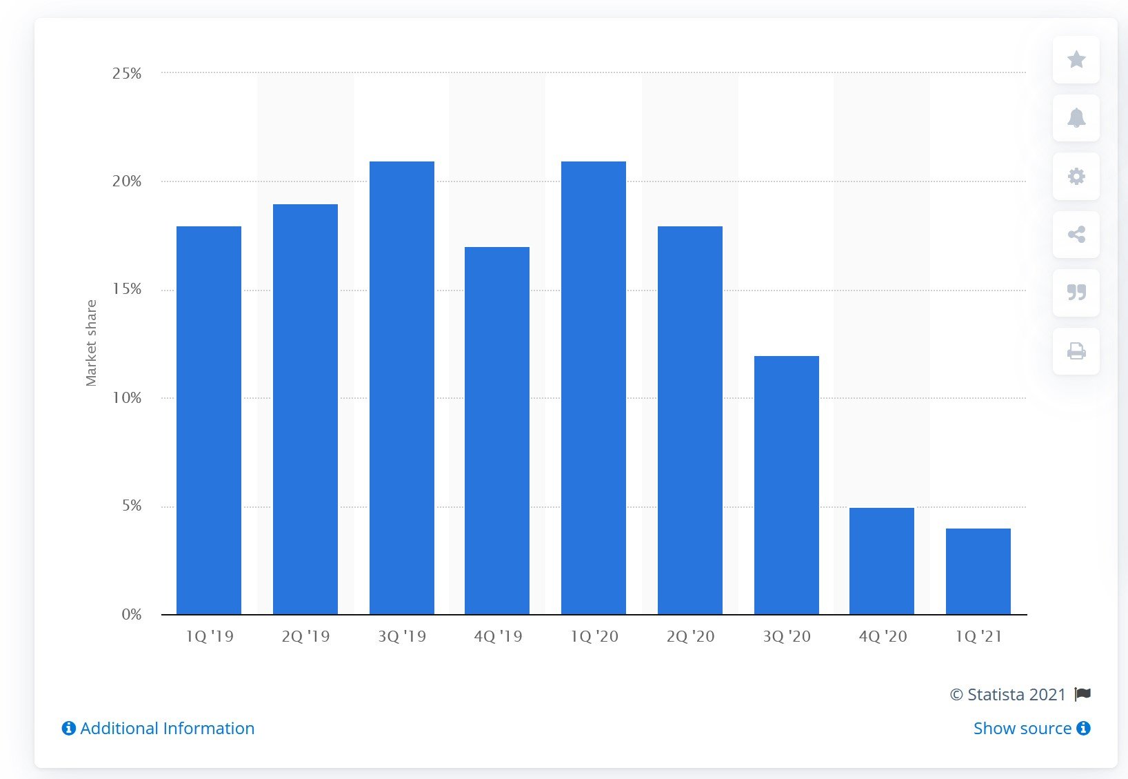 La decisión ha sido terrible para Huawei, que ha perdido su posición absolutamente dominante tanto en Europa (esa gráfica de Statista proviene de esos datos) como en el resto del mundo. Incluso en China, ojo, pero es que el problema ya no es solo que no puedan meter Google Play, el problema es que tampoco pueden acceder a chips que eran clave para sus smartphones. Huawei, como indica esta otra gráfica de Canalys, está desangrándose.