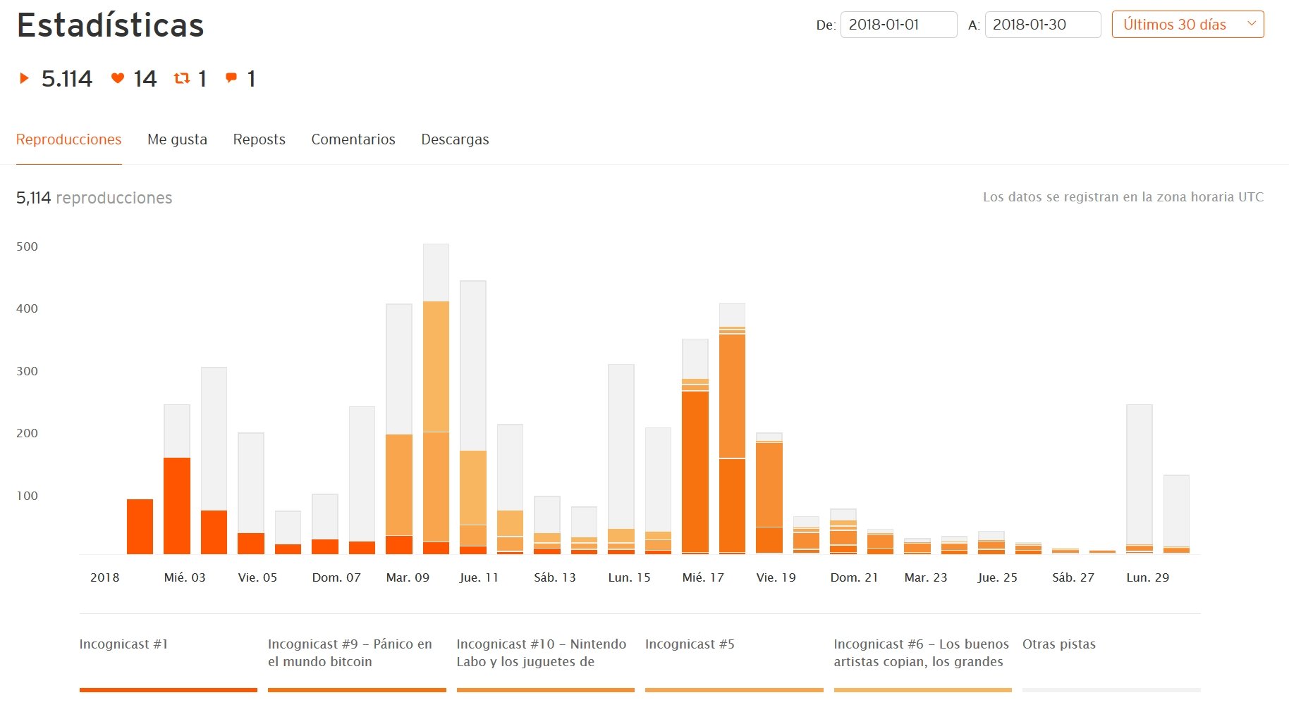 Las dudas me asaltan, porque aunque querría poder dedicar más tiempo al blog y al podcast, la realidad es la que es. Y luego está el del retorno, claro: ¿qué funciona mejor? Llevo muy poquito con Incognicast así que es normal que el despegue esté siendo lento. O eso me parece a mí, porque la media se sitúa en unas 400 reproduccciones/descargas para cada capítulo según mis datos, y hace unas horas que he pasado de las 5.000 reproducciones en total. No es mucho (o eso me parece), pero como tampoco sé cómo le va a otra gente, no puedo asegurarlo.