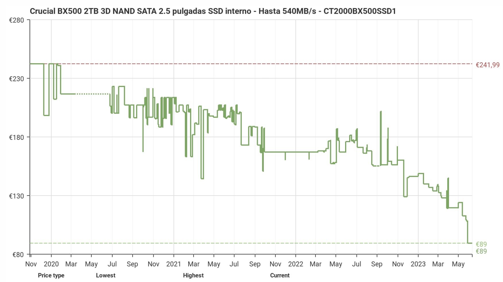 Más ejemplos: una unidad SATA más tradicional pero que puede seguir dando mucho juego, la Crucial BX500 de 2 TB, está a 89 euros en Amazon ahora mismo.