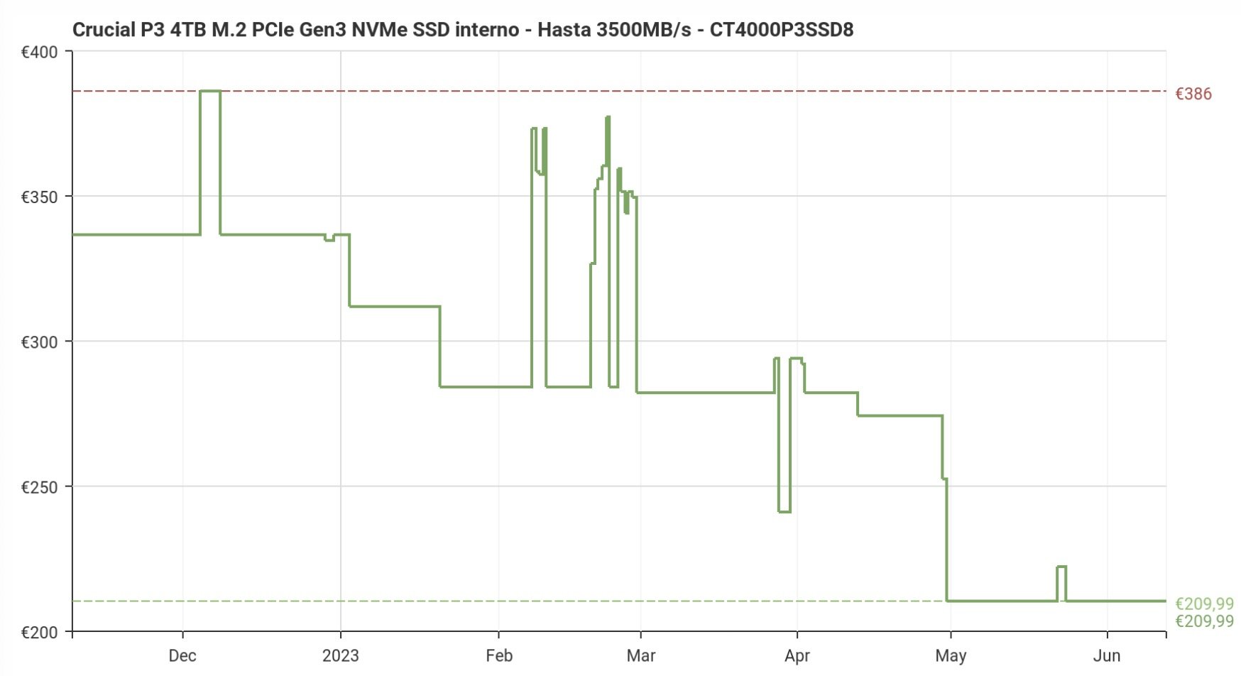 Otro ejemplo, la unidad M.2 PCIe Crucial P3 de 4 TB, que ahora mismo está a 209,99 euros en Amazon.