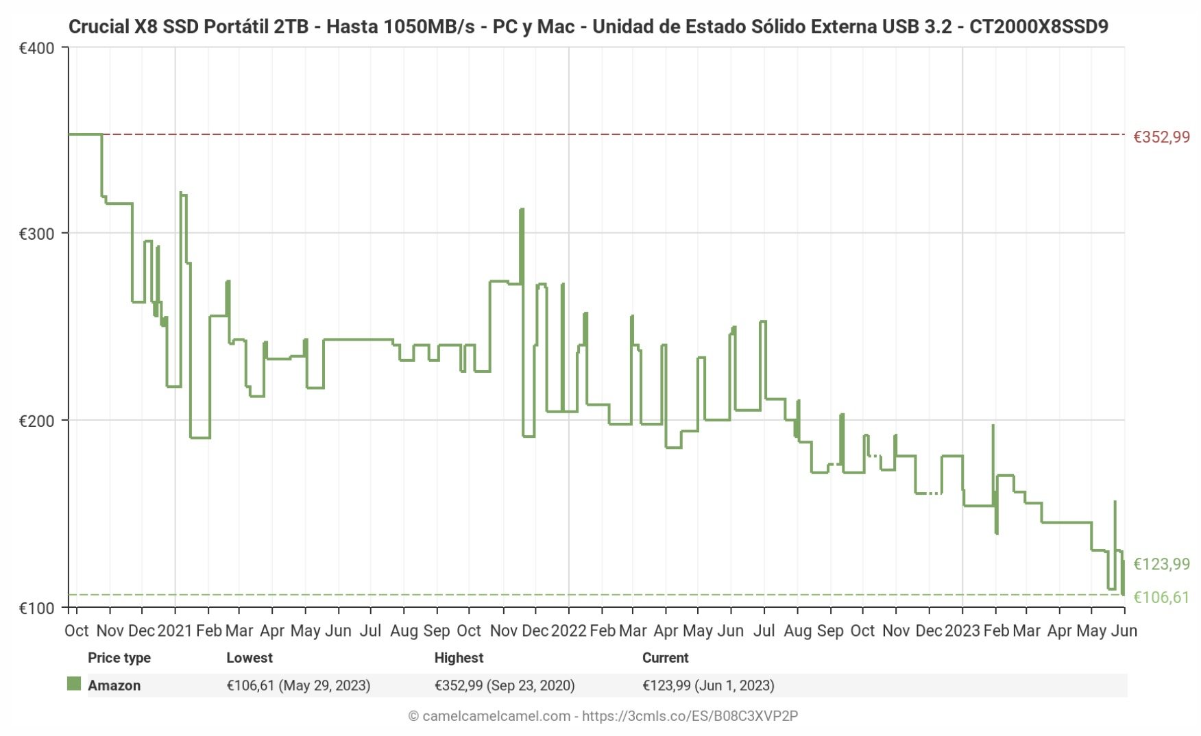 Primer ejemplo: la unidad externa Crucial X8 de 2 TB, que ahora mismo está a 119,99 euros en Amazon (el otro día estaba a 109) y que es un absoluto chollazo :