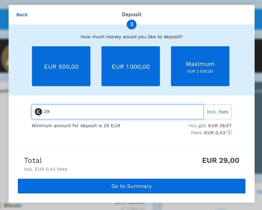 Actualización: ya está hecho. Tengo una cuenta en Bitpanda en la que dejan hacer depósitos de efectivo a partir de 25 euros (justito), porque para comprar criptodivisas primero tienes que tener dinero transferido a estos servicios. El proceso, por si os pica la curiosidad, es el siguiente: